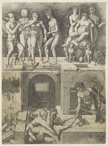 Editor: This is "Ignorance and Mercury," a print made by Andrea Mantegna sometime during the Renaissance. I'm immediately struck by how densely packed the figures are, particularly in the shadowy area, which gives a feeling of being trapped. What do you see in this piece? Curator: For me, it's a powerful statement about the societal role of art and knowledge. Look how Mantegna stages Mercury, the god of reason, pulling people out of this pit, literally rescuing them from ignorance. It reflects the Renaissance humanist ideal of elevating mankind through classical learning. Notice, too, the figure of Virtue partially destroyed – this is very much a statement about the perceived state of society. Editor: That makes sense. So, the chaos in the pit represents ignorance, and Mercury is…education? But who would have seen this image? I mean, was it for the general public? Curator: Precisely. Prints like these had a crucial public function. Consider the development of printmaking as a new media technology in that historical moment; it allowed artists like Mantegna to circulate their ideas, shaping cultural and intellectual discourse amongst learned elites. Editor: It’s like an early form of mass communication. But it's also kind of unsettling to think of knowledge as a tool to 'rescue' people. Does it carry some sense of elitism? Curator: That’s a sharp observation! The engraving absolutely reflects the hierarchies of its time. Whose ignorance are we talking about, and who gets to define ‘virtue’ or ‘reason’? And notice the visual emphasis, it's all directed on Mercury pulling folks out. What message is it sending about free will or socio-political progress? Editor: I never thought about the image having a subtle class structure. I came away with understanding the work having been a symbol of renaissance society being freed from ignorance. Curator: And seeing it today encourages you to inspect such symbols of cultural pride from the Italian Renaissance period, while also challenging to consider whose freedom is valorized, as you mentioned before!