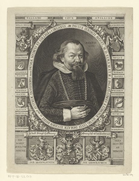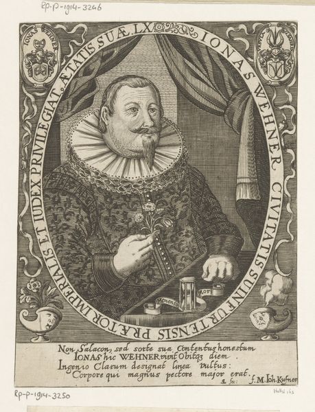 Curator: This is a portrait of Salomon Schweigger, an engraving crafted in 1605, now residing in the Rijksmuseum collection. Editor: My first impression is that of contained drama, there's so much contained symbolism trying to break free from that oval frame! The high ruff almost imprisons the figure’s head. Curator: Indeed. Let's begin by observing the careful articulation of line and form. The artist, Heinrich Ulrich, uses hatching and cross-hatching with great precision to define the contours of Schweigger’s face and attire. Consider, particularly, how the fall of light accentuates the planes of his visage. Editor: But the real story for me lies in the printmaking process. Consider the labor involved in etching and engraving those intricate lines on the metal plate. Each mark required a deliberate physical act and that is how meaning is brought out, rather than inherent properties of the figures, as some believe. What does that labor impart on the final product, do you think? Curator: Certainly, the labour is significant, though perhaps less illuminating. Consider instead the symbology: the hourglass reminds us of the transience of life, or the scroll with Greek inscription that alludes to knowledge and scripture and adds layers to our understanding. We see not only Schweigger the man but also an evocation of early 17th-century values. Editor: And those values were being rapidly shaped by the technologies of dissemination—like printmaking! These engravings, reproducible en masse, carried cultural capital but also physically circulated new ideas through merchant and trade networks that are physically being pushed by the labor behind their making. Curator: A pertinent point, and yet, perhaps these material realities fade somewhat against the overall composition—the strategic balance of light and dark, the symmetrical placement of figures framing Schweigger's portrait, and even the contrasting textures—all speak to a highly refined sense of aesthetics. Editor: Perhaps... I find myself always drawn back to how these objects came into being, and who had access to them and why, as material objects made by human hands circulating among other hands, but that is the nature of where I find art meaning to lay. Curator: An enriching counterpoint that makes this piece ever the more intriguing to unpack and think about the context through new lens. Editor: Precisely! And with that, perhaps it’s time for our listeners to move onward in the exhibition, now carrying that context with them, as they consider where else they might be finding that the same rings to be true for other artwork.
