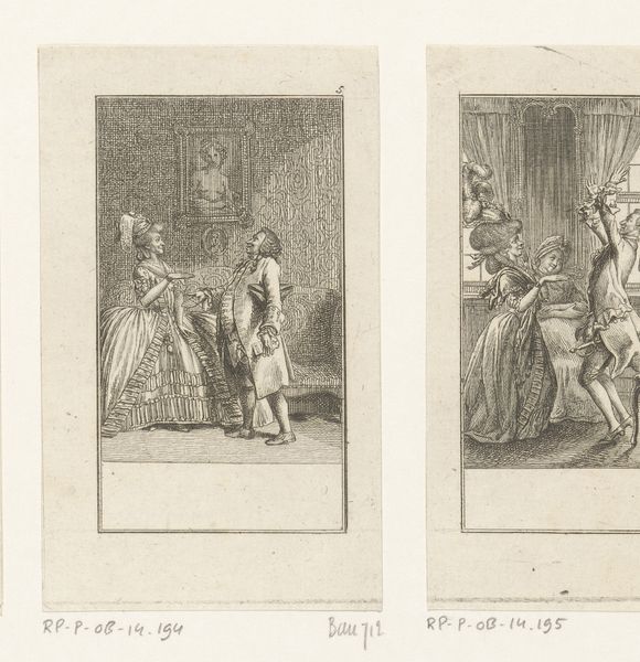 Curator: Daniel Nikolaus Chodowiecki created this engraving, aptly titled "Drie heren in de dierentuin opzoek naar een bruid", or "Three Gentlemen at the Zoo Seeking a Bride", in 1784. Editor: My initial impression is one of lightheartedness and intricate detail. The Rococo style lends a certain flirtatious air to the scene, doesn't it? The meticulous lines in the engraving really bring out the textures of the fabrics and the expressions on their faces. Curator: Indeed. The print offers a satirical snapshot of societal rituals surrounding courtship and marriage. The zoo, or menagerie, functions as a stage. Observe how the gestures and poses of the men mimic a performative display—the search for a 'bride' likened to observing animals on display. Editor: The composition strikes me as very deliberately divided. There’s a strong contrast between the outdoor setting of the men, filled with open sky, and the confined interior space with the two women, setting up opposing values. Curator: The interior could well be mirroring societal confines expected of women. It certainly emphasizes the very different roles prescribed to each gender. Think of the heavy costumes of the elite; their symbolic burdens shape how the figures exist in this narrative. Consider, too, the animalistic metaphors ingrained in the rituals of seeking a spouse. Editor: I see that play in the positioning of the women, slightly off to the side, presented as objects of scrutiny. From a formal perspective, the figures are placed so precisely that it highlights that performative element, underlining their conscious display. Curator: Absolutely, and the symbolism inherent to Rococo is often infused with societal critique beneath all the powdered wigs and extravagance. Chodowiecki keenly comments on social theater and arranged unions. Editor: The visual structure really mirrors and emphasizes the staged social rituals that you mentioned. It all serves as an apt method of encapsulating its themes. Curator: It does leave us reflecting on how much these rituals of courtship have changed—or haven't—over the centuries. Editor: Precisely. I can’t help but think of the inherent tensions—surface appearances, restrictions, hidden societal judgements— captured within its delicate lines.