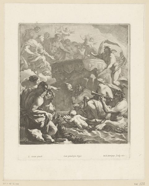 Editor: So, this is a photogravure of "The Miraculous Draught of Fishes," made before 1858 by Schelte Adamsz. Bolswert, after a painting by Peter Paul Rubens. The printmaking technique creates a very textural effect. It almost feels like you can see the effort of hauling in the impossibly full net, but I'm wondering about the story behind this scene and its visual impact at the time. What can you tell me about the history of this work? Curator: Well, thinking about the socio-political context of Rubens and later Bolswert, this image operates on multiple levels. On one hand, it is a straightforward representation of a biblical miracle, meant to inspire faith. On the other, Rubens was a master of Baroque drama and employed this in the service of religious and political propaganda. What purpose might a narrative such as this serve for the powerful members of the church and aristocracy at this moment? Editor: Perhaps by emphasizing faith and divine intervention, it reinforced existing power structures? That this system had divine support. It sounds cynical to say aloud. Curator: Exactly! Reproductions like this one extended the reach of such visual narratives to a wider audience. It's not just about the beauty or the technique, but about the ideas and social meanings that it conveys and reinforces. This was particularly potent within the context of the Counter-Reformation where the imagery becomes explicitly didactic. Editor: So, this isn't just a picture, it’s an instrument of cultural and religious power! A meticulously crafted statement embedded in its historical context. Curator: Precisely! Recognizing this expands how we appreciate not just the piece's artistic elements, but also its contribution to shaping cultural norms and social narratives. This lens makes the artwork more interesting, I believe. Editor: Definitely. It adds another dimension that deepens my understanding of its meaning. Thank you!