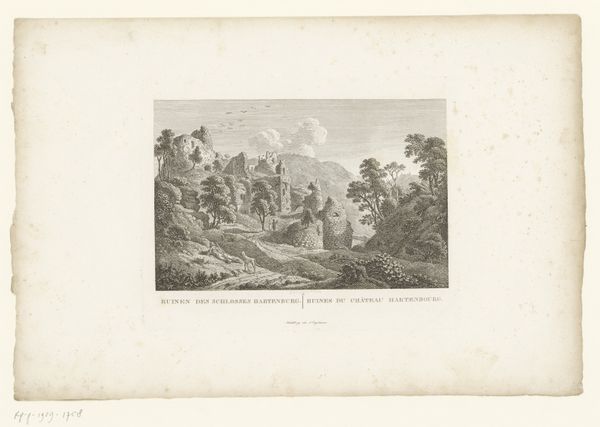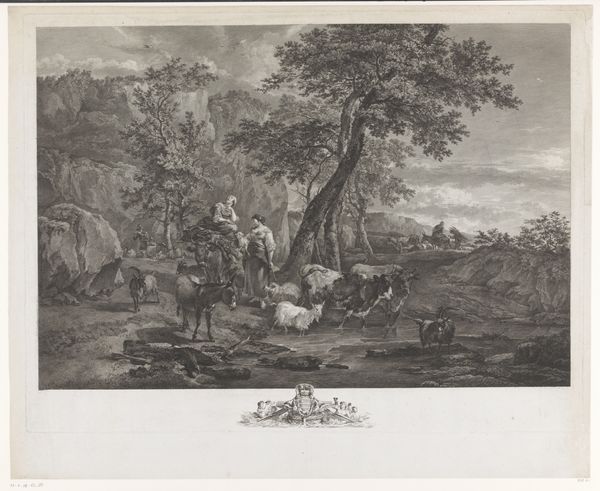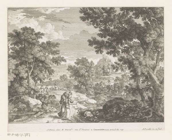 Curator: What a beautifully rendered vista. This is a print by Nicolas Perelle, entitled “Landschap met figuren op rots”, which translates to “Landscape with figures on a rock.” It was likely created sometime between 1613 and 1666. Editor: It feels grand, but somehow contained. The landscape is sweeping, yes, but the close attention to the rockface, the carefully placed figures… there’s an intimacy that I wasn’t expecting from a baroque landscape print. Curator: Precisely! Look how Perelle uses the rock formation as a kind of stage, elevating the figures and allowing us, the viewers, to participate in their seemingly quiet observation. Do you notice any recurring visual elements? Editor: I see the light and airy sky contrasted with the dark and intricate textures of the trees. There’s definitely a symbolic weight in that juxtaposition; an opposition between heaven and earth. It resonates deeply with traditional religious symbolism that was being negotiated throughout Europe. Curator: That's insightful. The figures become a visual metaphor themselves: bridging this gap between the earthly and the divine, much like religious orders sought to do. It also gives a social framework, hinting at travel or commerce as men with horses trudge across the valley. It asks questions about humankind’s place within nature, a key question during the period. Editor: That focus on the “place” of humanity interests me—do you think that its current display setting at the Rijksmuseum gives it more significance now? Placed within a context of Dutch Masters? Or is its baroque style from a French engraver somewhat alien to the museum? Curator: I find it incredibly generative. Baroque is an important element of Dutch art and commerce from this period; by incorporating different stylistic approaches, “Landschap met figuren op rots” invites richer interpretation. It encourages us to expand beyond our usual frame, challenging assumptions. Editor: An excellent point. This print offers us a space to reflect not only on the relationship between humanity and nature but also on the art world and society at large. Curator: I concur entirely, thank you.