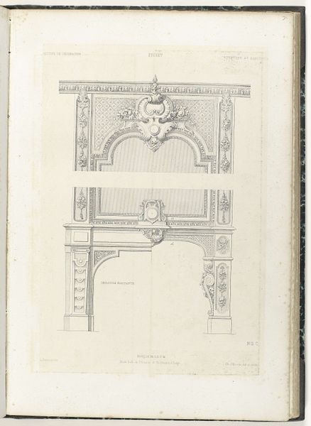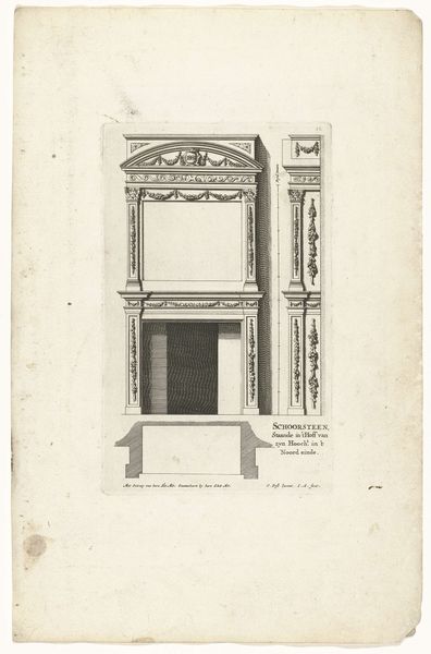Editor: This is "Onderboezem in Paleis Huis ten Bosch," a 1664 print, an engraving really, by Jan Matthysz. It's such a precise, almost technical drawing, but the detail gives it a real sense of grandeur. What catches your eye when you look at this? Curator: Well, first, let's consider the context. This engraving represents architectural design during the Dutch Golden Age. How does that make you think about its purpose beyond just being a picture? Editor: I guess it was meant to showcase Dutch affluence and artistry... and perhaps, power? Curator: Precisely. Huis ten Bosch was a significant political symbol for the House of Orange. This idealized fireplace, therefore, wasn’t just functional. What details point to it being something *more*? Editor: The heraldry at the top! It signifies lineage and authority. And all the classical lines... Curator: Good eye. The geometric precision speaks to an era of burgeoning scientific understanding and a desire for order and control, don't you think? Line engravings were popular ways to distribute visual knowledge; who was Matthysz, and who might have seen it at the time? Editor: That is an important question. He could have been contracted to create it as a kind of public relations initiative... reaching architects and other nobility? Curator: Exactly! We must remember how public images helped define identity and advance political agendas even back then. And understanding the visual language is key to unlocking how the elite projected their image. This reminds us that art isn't created in a vacuum, and often reflects - or even reinforces - systems of power. Editor: I never considered the "political" life of fireplaces. This print made me realize that every image is deeply intertwined with society. Curator: Indeed, that’s the fascinating complexity of studying art history. Always question the power dynamics at play.