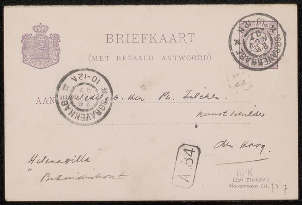 Curator: This is a postcard, a “Briefkaart aan Philip Zilcken” created by Marinus van der Maarel sometime before 1895. The media involved are drawing with pen and ink, displaying prominent calligraphy. What's your immediate take on it? Editor: It's fragile and immediate. I’m struck by the contrast between the mass-produced aspects like the printed "BRIEFKAART" and the very personal, gestural quality of the handwritten address and the postmarks. Curator: Indeed. Postcards became incredibly popular during this period as they provided cheap communications, aiding the burgeoning tourist industry but also fostering institutional, bureaucratic exchange, what with the postal union detailed on the card itself. Editor: Right, but I’m focused on how that handwriting implicates the human element and skilled labor. Notice how the flourish of the pen and ink transforms an everyday postal service product into something unique and considered? Curator: It does become an interesting artifact when you consider that postal systems were essential tools for governments to implement state control. This card represents state-sponsored bureaucracy that facilitated societal regulation through standard communications practices. Editor: Standard practices undermined by the intimate, haptic marks of the sender. It's fascinating how these pen strokes carry with them their own history and effort. The card almost reads like an artwork. It’s cheap communication, but the handwriting elevates it. It turns postal bureaucracy on its head, a little! Curator: The stamps and postmarks themselves denote authority, almost a ritualized form of validation from governmental sources and the card’s global networks as well as how these systems shape lives through the seemingly mundane processes of communication. Editor: I see what you mean! For me, this artwork isn’t just about officialdom though. It's a dialogue between standardization and individuality—the intersection of an efficient machine of postal communication and one individual’s human and expressive touch. Curator: Considering that angle highlights the postcard’s importance in the societal and institutional contexts of its time, thanks. Editor: And for me, it helps understand the postcard as more than an everyday artifact – as a tangible embodiment of past human efforts that prompt emotional and personal investment.