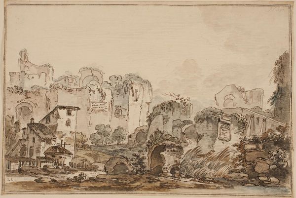 Editor: Here we have Jens Petersen Lund’s "Romersk" prospekt, likely created between 1730 and 1793, utilizing drawing and watercolor. The earthy tones give it a slightly faded, nostalgic feel, like looking at a cherished memory. What strikes you most about this piece? Curator: It's interesting to consider the social context of this "prospect" view. These weren't just aesthetic exercises; they were products tied to consumption and class. Lund is offering a romantic vision of Rome, readily accessible to those who could afford to collect such images. Editor: So, like a souvenir? Curator: In a sense, yes, but more than that. Look at the specific materials: paper, watercolor. How were these acquired? By whom were they produced? This informs our understanding of Lund's process. The widespread availability of paper during that time signals the democratization of art, albeit limited by social class. The means of production shape the work’s meaning. Editor: I see what you mean. The *act* of creating this, from the ground up, really influences how we view it. It’s not just a pretty picture. Curator: Exactly! This piece bridges the gap between ‘high art’ and ‘craft’. The labor involved in both creating the image and obtaining the materials connects it to the broader economic landscape of the time. Do you see the visible brushstrokes? Those aren't accidents; they are deliberate marks of production. Editor: I do now. It's easy to forget about the physical work that goes into these historical pieces, thinking of them as these untouchable relics. Thanks for pointing out all these production facets. Curator: It highlights the consumption aspect tied to cultural capital. Considering the social and material dimensions adds depth.
