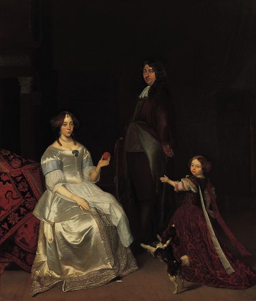 Editor: This is "Portrait of a Woman and a Man in an Interior" by Matthias Wulfraet, created in 1694 using oil paint. I’m struck by how dark it is, but then there's this airy landscape in the background through the archway. What elements do you find most compelling here? Curator: Formally, the composition invites a nuanced reading. The tenebrism, that stark contrast between light and shadow, undeniably directs our gaze. Notice how the artist uses chiaroscuro to sculpt the figures, giving them a pronounced three-dimensionality, and how the textural contrast between the dark fabric and the pristine architecture is striking. Consider, also, the placement of the figures in relation to the implied vanishing point beyond the archway. Does that receding space invite a feeling of balance, or a disruption of symmetry? Editor: It's a little of both, actually! The couple is clearly the focus, but that little glimpse of a brighter world kind of pulls me out of the room. The small dog almost feels like it is anchoring the darkness, though. Curator: Precisely. The animal offers a grounding element, preventing the darkness from becoming all-consuming. Consider also the objects they hold. What function do they perform in your interpretation of the piece’s formal arrangement? Editor: Well, the man holds a glass, but the woman holds an apple. I don't know, are they references to knowledge or temptation? Curator: It is that contrast which elevates the painting from mere representation. Without resorting to simplistic iconographic readings, consider how their inclusion alters the visual dynamic between the figures, how the painting plays upon contrasting and competing semiotic structures, disrupting simple decoding of a 'marital portrait'. Editor: So, it’s not necessarily about what the objects symbolize, but how they contribute to the visual relationships within the painting itself? Curator: Exactly! Understanding how the constituent components operate within the pictorial space enables an aesthetic appreciation independent of external references. Editor: That's such a useful way to approach art. Thanks! Curator: My pleasure, reflecting upon the compositional organization grants us access to a fuller understanding.