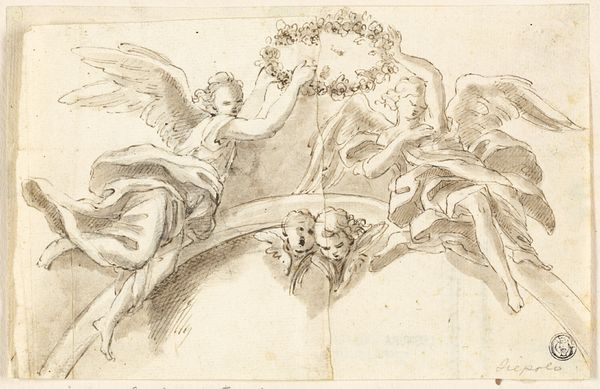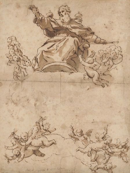 Curator: Agnolo Bronzino's drawing, "The Fall of Phaethon," dating from about 1555 to 1559, vividly captures a moment of divine retribution. What are your immediate thoughts looking at this pencil drawing? Editor: Chaos! The eye struggles to find a stable point. It's a cascade of bodies, equine and human, all rendered with this incredibly sharp, almost academic precision that seems at odds with the subject matter. Curator: The figures certainly exude that Mannerist elongation and idealized form. But consider Phaeton himself. Plunging from the heavens, a victim of his own hubris in attempting to drive the chariot of the sun. The image reverberates with warnings about unchecked ambition. Editor: True, but the composition pushes the narrative towards overload. I mean, look at the anatomical detail in the horses! Bronzino's meticulous approach ironically undermines the drama. We see a skillful study of forms in dynamic disarray, rather than feeling the cataclysm. Curator: I disagree. That careful rendering heightens the tragedy. These are not just bodies, but representations of classical ideals, violently disrupted. The cluster of terrified river gods below anticipates the repercussions of Phaeton's actions – a visual metaphor for cosmic disorder. The pencil becomes almost like an instrument of psychological excavation. Editor: Perhaps, but the detachment remains. The tonal range is limited; the shadows meticulously hatched, never truly engulfing. I find it intellectually engaging but emotionally...muted. The symbolism doesn’t necessarily translate into raw feeling for me. Curator: Consider the myth's cultural function in 16th-century Italy. It served as a potent reminder of the importance of order, tradition, and respecting established hierarchies –values crucial to the ruling families who commissioned such works. The image speaks, not only to Phaeton's personal downfall, but to the wider implications of disrupting the social fabric. Editor: An intriguing point. Seeing it now less as an exercise in anatomical virtuosity, I can almost see that coldness almost amplifying a more calculated kind of dread. Still, technically the piece does sacrifice that sense of immediacy in pursuit of that tight formal articulation. Curator: So, maybe we meet in the middle –a meticulously rendered fall from grace that speaks volumes about the anxieties of its time. Editor: A persuasive final reading, that makes you consider just how powerful even in pencil is this Italian Renaissance exploration into narrative.