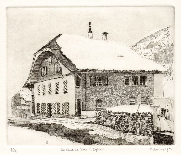Hubertine Heijermans created this print of ‘The church and tower of Gsteig, in canton Bern’ in 1986. The composition is dominated by architectural forms rendered in fine lines, creating a textured, almost palpable surface. The church and adjacent building are positioned to draw the eye upwards, complemented by the mountain in the background. Heijermans employs a delicate balance of light and shadow to define shapes and spatial relationships. This structural clarity invites you to ponder the interplay between the constructed environment and the natural world. Consider how Heijermans uses the print medium to investigate themes of structure and form. Each line and shadow contributes to a complex semiotic system, inviting ongoing interpretation. The etching is not just a representation of a place, but an exploration of how we perceive and construct our surroundings.