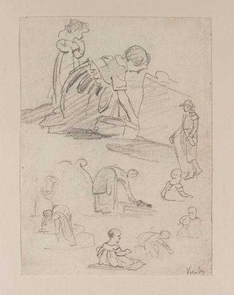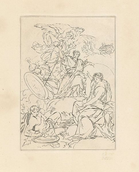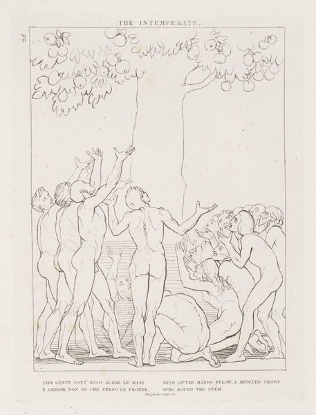 Editor: This is Jules Pascin’s "Bacchus", a small etching. The figures seem caught in a moment of revelry, but there’s also a sense of vulnerability in their postures. What layers do you see at play here? Curator: Pascin, writing "Bacchus" into the print itself, invites us to consider the complicated history of representing the god of wine. It's more than just celebration; it's about power, transgression, and who gets to participate, isn't it? Editor: It seems so... intimate and public at the same time. Curator: Exactly. Pascin highlights the tension between individual experience and collective identity. The figures' nudity, their gestures, all contribute to this discourse. Is this liberation or exploitation, or perhaps both? Editor: I hadn't thought of it that way. It makes me question my initial assumptions. Curator: That's the power of engaging with art, isn't it? It challenges us to look deeper, to consider multiple perspectives. I'm also intrigued by Pascin's choice to etch this image, as it is traditionally seen as a medium for the more classical arts. Editor: So, the piece almost questions itself. Thank you. Curator: My pleasure. Now you can carry a new lens for looking at art!