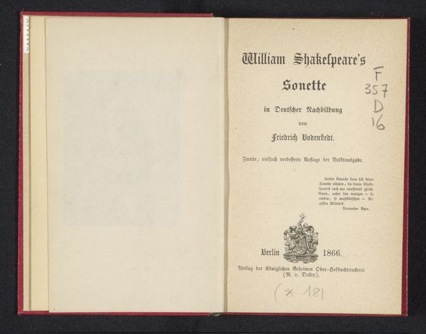 Curator: The work before us is the title page for "Aus meinem Bühnenleben," or "From my Stage Life," a book published in 1876. Editor: The phrase, especially with the fraktur typeface, makes me think of old theater posters and shadowy figures behind velvet curtains. It hints at dramatic reveals, whispered secrets. Curator: Precisely. The text, arranged in a very deliberate hierarchy, announces that it is a book of memoirs by Karoline Bauer, edited by Arnold Wellmer. The claim of being the second, significantly expanded edition suggests an initial success. Editor: The aging of the paper adds to that sense of history. It’s almost a character itself. Each speckle seems to hold some of the stories promised by the cover. Does the eagle symbol printed near the base suggest it was endorsed or official in some way? Curator: Indeed, that is the Prussian coat of arms. And it tells us about the original publisher – Verlag der Königlichen Geheimen Ober-Hofbuchdruckerei, implying it was the publishing house for the Royal Court. Editor: I can almost hear the rustling of its pages. Knowing the publishing house, it takes the personal narrative of a stage life, as you suggested, and elevates it somehow. A paradox. Curator: A delicious one, isn't it? The choice of typeface, the layout – everything contributes to a sense of considered gravitas, setting expectations about how the stage life will be presented. Editor: The German Expressionism label suggests an emotional current too, even with formal conventions. Perhaps there are intense confessions within, barely restrained by that careful typeface. Curator: Undoubtedly. There's a tension here between the formality of print and what I imagine might be raw emotion, if "Stage Life" holds the experiences implied by it's genre. Editor: Overall, it evokes a beautiful contradiction, doesn't it? Official formality meets the hint of stage-life scandal. It would be very fun to dive into this to see which direction is most compelling. Curator: Indeed; from the publisher down to the type and faded script, its historical encoding yields fascinating information, just waiting to be unlocked.