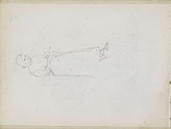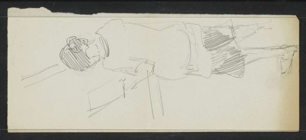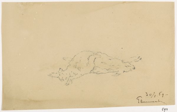 Curator: Ah, "Slapende Kat," or "Sleeping Cat," by George Hendrik Breitner, dating back to 1888. This intimate pencil drawing now resides in the collection of the Rijksmuseum. Editor: There’s a remarkable intimacy in the way Breitner captures this animal. It's rendered with such lightness of touch. I find the simplicity and fluidity quite appealing—very much of the moment. Curator: Indeed. It embodies the Impressionist spirit through its unassuming subject. Consider the cat as a domestic symbol. Cats carry immense significance cross-culturally: as gods, as symbols of domesticity and grace. They’re powerful representations of independence, tied to femininity throughout the ages... Breitner reduces these weighty historical references into mere gentle strokes on paper. Editor: Agreed, it is quite devoid of drama! The texture achieved purely through the graphite pencil itself adds to its charm. Look closely at how he uses cross-hatching to define form and volume, it's not hyper-realistic. And while he's suggestive, not detailed, you sense the soft weight of the animal. It becomes a study in the economy of line. Curator: Breitner certainly distills the essence of slumber. One wonders if there is a correlation between his intimate depiction of domestic space with a parallel interest in how gendered experience shaped culture and everyday social norms. Editor: Well, whatever it may symbolise, the work succeeds foremost as pure form: a compelling study of line and shape that achieves more through omission than it does through concrete representation. It allows the viewer to project, complete the image with their own imagination. Curator: True enough, and the image, though small, resonates widely—evoking tenderness, inviting contemplation on the beauty of stillness. Editor: A beautiful sketch.