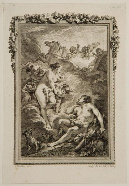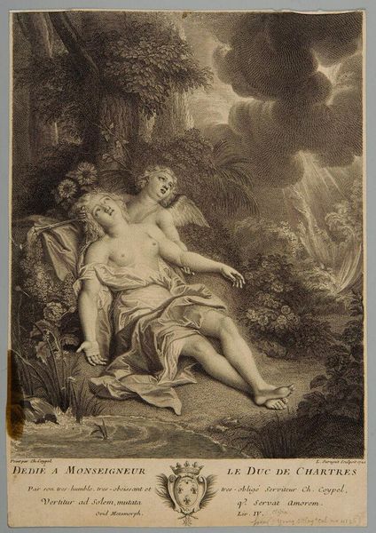 Curator: This is Jean Pelletier's "Narcissus." Pelletier, born in 1736, captures the tragic myth of Narcissus in this print, currently held at the Harvard Art Museums. Editor: It’s so melancholic, isn’t it? All those shades of gray make it feel like a faded memory, like love lost before it even began. Curator: Indeed. The subject of Narcissus has enjoyed enduring appeal, interpreted across centuries as a cautionary tale. Editor: Do you think he ever got bored, staring so intently? Did he ever think, oh, hang on, I'm parched! Or did he become the water itself? Curator: What I find compelling is how Pelletier’s "Narcissus" contributes to a larger history of representing ideal beauty and its perils. Editor: Well, maybe he's not just vain, maybe he's just finally seeing himself clearly. Food for thought. Curator: It is that. Each interpretation tells us something new about beauty, obsession, and the enduring power of myth.