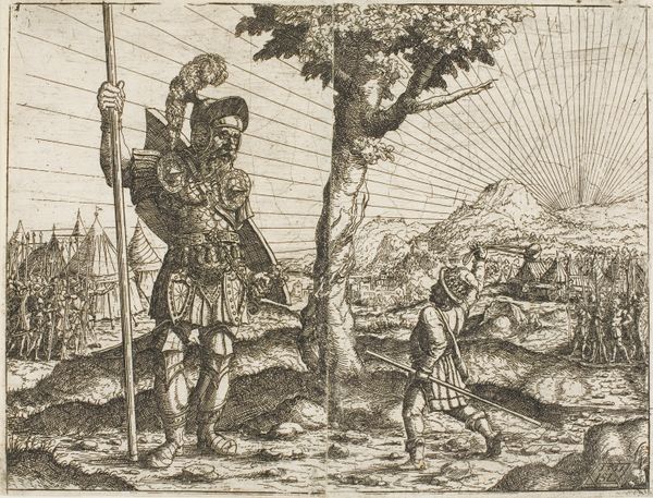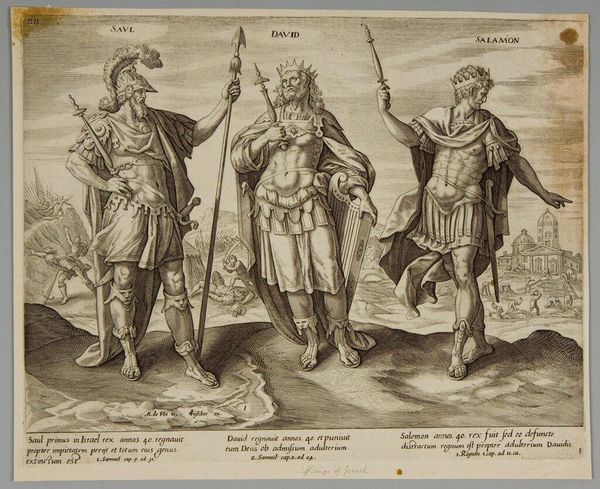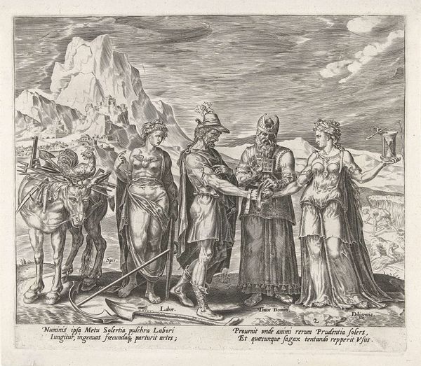Philips Galle created this engraving, titled "After death, labor is rewarded with the love of Christ," in the late 16th century. The composition immediately strikes us with its allegorical figures arranged around the central cross, using the stark contrast of light and shadow to guide our eyes. The formal structure of the work is built upon a tension between earthly toil and divine reward. Notice how labor, depicted kneeling and bound, contrasts with the upright and illuminated figure of Christ. This visual arrangement highlights the period’s religious and philosophical discourse, presenting earthly suffering as a path to spiritual liberation. The linear precision of Galle’s engraving technique, especially in delineating the textures of skin and fabric, adds to the sense of drama. Galle employs a semiotic system here, where chains, light, and the cross symbolize struggle, salvation, and faith. Through this lens, the image becomes a powerful meditation on the human condition. Consider how this interplay encourages us to reassess the values of work, suffering, and redemption.