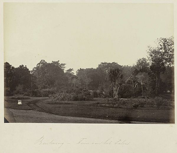 Editor: This is "Samarang - Chineesche Graftomben," a gelatin silver print from somewhere between 1863 and 1869, by Woodbury & Page. The muted tones create such a reverent mood... all those statues and greenery create a tranquil place. What strikes you most about this photograph? Curator: It's fascinating how funerary art often borrows from cultural memory to create these 'eternal dwellings'. Note the symmetry. The lions. The figures. In Chinese tradition, lions protect, but more broadly, they tell of power, guardianship, and even the warding off of evil spirits, even though these figures are so eroded. What feelings are stirred when considering the presence of these grave markers? Editor: I find it a little sad, maybe even lonely. Like these figures have been standing guard for centuries. I’m interested in that eroded quality. Is there more to it than just the weather? Curator: Indeed. It's not just wear. The aging of stone or photographic emulsion represents the relentless passage of time and acts as a memento mori. Think of them as metaphors for fading empires, forgotten legacies. Now, knowing the context and considering the symbols, does the scene evoke a different response? Editor: I think I can appreciate that. These statues standing in memorial embody more about history than just a peaceful place for remembrance. Curator: Exactly. Through the imagery, we're touching on a conversation with history. Perhaps that is one way to engage with a piece of art and the many layered cultural messages that they carry. Editor: Absolutely! It helps me think beyond the immediately visible elements.