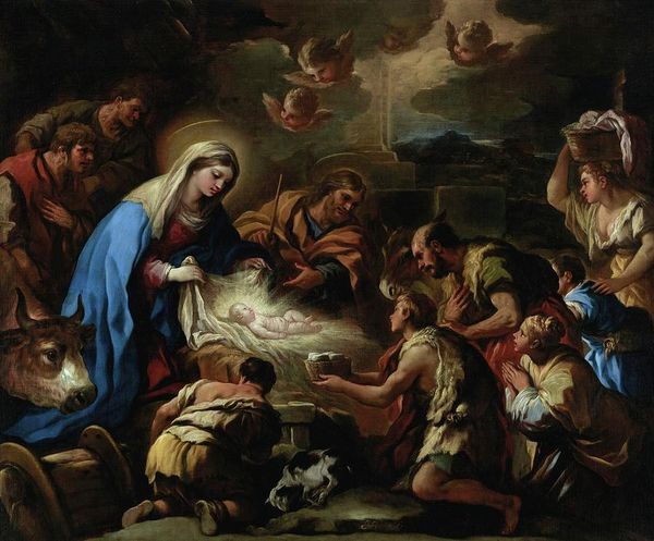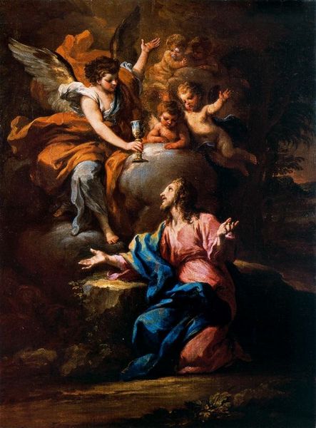 Curator: This piece is "Virgin and Child with St James the Great," painted in 1786 by Luis Paret y Alcázar, rendered with oil on canvas. Editor: It's striking how ethereal the scene appears at first glance; the soft colours and oval format create a very dreamlike, reverent atmosphere. Curator: Yes, Paret, despite facing certain social exile from court circles during his career, maintained his prolific production and a real mastery of technique which allowed him to create striking allegorical compositions such as this. His baroque sensibilities and his technical virtuosity are palpable. Editor: Looking closer, one notes how the work might engage with political messaging. The representation of religious icons was, as usual, a way to communicate a vision of power to a wide population. Is there any context related to the Court that might enlighten the significance of the Santiago depiction in this precise piece? Curator: Paret often had to modulate his messages, as it were, carefully maneuvering in his artworks so that the message served his interests and that of those of his sponsors. His handling of materials – the way he builds up layers of oil paint, and how he achieves the translucence of the fabrics – speak to that level of carefulness. Editor: You can really see that considered layering especially in the cherubic figures above and on the left—so soft! How interesting that a court artist, with those responsibilities and possible frustrations, would work so meticulously in his private pieces. It raises interesting questions about labor and production... Curator: Precisely, the labor aspect. It’s impossible to dismiss the layers and intentionality built into works created during this period as Paret's life and production, regardless of the social constraints that affected him, demonstrate baroque’s dynamism during the late 18th century. Editor: Examining the material and process in tandem with social conditions, shifts our appreciation – doesn't it? It adds depth. Curator: Absolutely, and reveals the multilayered reality artists navigate even in allegorical depictions such as this one. Editor: Indeed, considering its context helps reveal a painting rich with intention and ingenuity, far more than what its sweet appearance may let on.