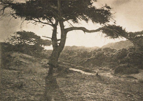 Curator: Ah, look at this photograph— "Grand Châtaignier au Bord d'un Chemin (Large Chestnut Tree on the Side of a Road)" by Felix Thiollier, probably taken around 1875-1880. A gelatin-silver print. Editor: It's bleak, isn’t it? Beautiful, yes, but stark. The towering tree, devoid of leaves, feels… exposed. It’s like witnessing a giant holding onto its dignity in the face of winter's assault. Curator: That "bleakness," as you call it, really underscores the material conditions and photographic processes of the time. Consider the environmental limitations in capturing such a scene. Think about the sensitivity of the gelatin-silver process and the landscape, transformed via its rendering as line and form. Editor: It's funny, because that’s what drew me in at first – the lines! The skeletal branches against that almost vacant sky... they’re etching themselves onto my memory. It reminds me a little bit of some Romantic landscape painting but through a technological process. Curator: Absolutely. Photography freed artists from literal depiction, and here, we see Thiollier engaging in form. Look how the textures of the bark are carefully rendered by the gradations afforded by the gelatin silver, inviting comparison of this relatively novel reproductive method alongside traditions of craft like engraving. Editor: But despite its focus on form and process, the emotional punch remains, no? That lonely road, the shadows clawing across the earth...it gives me a funny mix of comfort and… dread. Curator: Which could also speak to contemporary urbanizing influences on traditional modes of life. Landscape became a way for urban consumers to project backward in time or sentiment. A complex commodity chain made all this possible. Editor: Maybe that tree saw all that happening. Anyway, that’s art, right? It lets us look at something ordinary and see everything at once. Curator: Exactly, a fascinating look into the means of production meeting an engagement of place that remains…resonant, even today. Editor: Indeed. So, next exhibit, please. This lone giant has left me with just enough comfort to confront something else entirely.