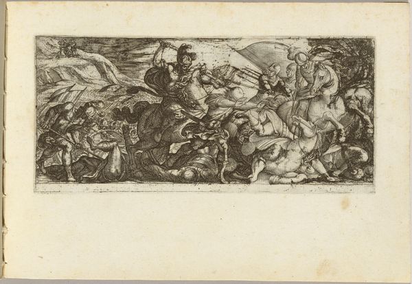 Gerard de Lairesse created this print, "Amazonenslag," using etching techniques. The intricate details of the figures and horses, rendered with fine lines, create a dynamic composition across this small surface. The scene depicts a battle, likely drawn from classical mythology. The eye is immediately drawn to the chaotic arrangement of bodies and horses. Lairesse masterfully employs line to convey movement and tension. Notice how the converging lines create a sense of depth and draw us into the heart of the conflict. The figures are depicted with detailed musculature and expressive gestures, adding to the drama. Prints like this one were intended for a wide audience, illustrating classical narratives and moral themes. Lairesse's use of line and form embodies the period’s interest in order and classical ideals. It is through the structure of the image itself that we are invited to interpret and re-interpret this timeless battle scene.