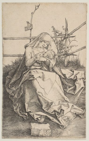 Curator: Immediately, the image gives the impression of being very subdued and intimate; Mary Magdalene gazes down, holding a cross, with what appears to be a skull resting next to her. Editor: Yes, a potent visual contrast! This is an engraving depicting Heilige Maria Magdalena, or Saint Mary Magdalene, currently held in the Rijksmuseum. The engraving technique adds to the vanitas thematics here. Curator: You're right about that; looking closely, you see how the delicate use of line work emphasizes the textures of her hair and garments, even highlighting the smoothness of the skull. Given this being a print, I find it necessary to wonder about the role that the mass production and consumption of this image played at the time. Editor: Good question. During the late 16th and 17th centuries, engravings and prints of religious figures allowed for broader distribution of such imagery, thereby expanding devotional practices outside of the Church walls. The image then becomes a more democratic art object. Curator: Certainly. The widespread availability also had the potential to normalize the visual iconography – Magdalene's humility becomes somewhat standardized in the domestic sphere through readily available reproductions of the image. I'm curious as to the studio practices required for production; was the image traced from another image, printed onto the plates for consistency and quality of line, and who did the labor for the printing of multiple versions of this drawing? Editor: Absolutely; by depicting Magdalene in this pensive state, holding a cross, perhaps leaning towards death – symbolized by the skull– the piece asks the viewer to contemplate their own mortality and relationship to faith and forgiveness within shifting social and political religious movements. Its purpose, beyond simple decoration, lay in spiritual guidance. Curator: Right, the context frames the meaning significantly; viewing it today we can appreciate the composition and linework, but for its intended audience, its didactic potential held considerably more significance. Editor: Indeed. Understanding how artwork like this functioned within society is key to unlocking its multilayered meanings for contemporary audiences. Curator: For sure! I wonder, what implications does this image have on labor in artistic workshops and the accessibility of religious art? Editor: Good point! Thinking through the social implications of art is what ultimately keeps things fresh for viewers in every new generation.