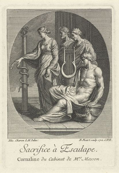 Curator: Welcome. Today, we’re looking at "Le Sicilien," an engraving dating back to 1713 by Gilbert Schoute. Editor: My first impression is a feeling of contained chaos. It’s like a stage set filled with actors who are each performing their roles, but without any clear direction. Curator: It is indeed highly theatrical. Schoute's masterful use of line and the etching technique creates remarkable tonal variation for what is essentially a black-and-white composition. Note how the precise arrangement of lines defines the textures and intricate details of each figure's attire and setting. Editor: And what narratives do those costumes and setting imply? The subjects feel pulled from different eras and social classes, and they almost clash in a way that reveals rigid societal boundaries and the performances people put on. It seems like an absurd satire of Baroque aristocratic culture. Curator: You rightly point to the element of satire. Consider the portraits adorning the wall. They suggest established traditions while the figures in the foreground enact a contemporary drama. This interplay generates tension within the defined pictorial space. Editor: That tension speaks volumes about power dynamics in play, perhaps critiquing male gaze and its objectification of women. The title “Le Sicilien,” alongside the depiction of the male figures in their positions of authority, brings forth broader socio-political implications concerning colonization and the control and domination over particular groups and territories. Curator: I appreciate your interpretation of colonial power relations, though, I must admit that its application might somewhat force itself onto the artwork. Nonetheless, the work's genius lies in the technical details—in the use of hatching, stippling and line to construct depth. These considerations are just as critical in grasping Schoute's intention as are the symbols within the image. Editor: Agreed; this interplay makes unpacking the imagery all the more dynamic. Understanding technique adds nuance and highlights the socio-historical contexts to broaden an analysis of class, gender, and culture as it relates to the construction of power and identities in the Baroque era. Curator: Indeed, Schoute's strategic play of shadows and lights gives weight and significance to figures, ultimately drawing viewers to decipher underlying narratives that resonate through technique and subject matter. Editor: Ultimately, analyzing these narratives gives us perspective to the complexities embedded in the representation of cultural encounters, class dynamics, and the gaze. These details are what makes "Le Sicilien" such a timeless piece.