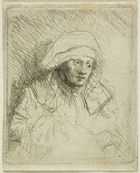 Jan Chalon created this etching titled "Man met muts," or "Man with a hat" around 1785, in the Netherlands. This piece offers a glimpse into the world and the individuals who occupied it during the late 18th century. The sitter, rendered with striking detail, is a man with a distinct hat. His gaze is both direct and contemplative, seeming to invite the viewer into his personal space, while keeping them at a distance. Chalon's skillful use of light and shadow brings out the textures of the man’s clothing and hat. The very act of portraying a man from what seems to be a regular background during this period, challenges the dominance of traditional portraiture, which often focused on the wealthy and powerful. Chalon's “Man with a hat” is more than just a portrait; it is a study of character, an observation of humanity, and a reflection of the changing social landscape of the 18th century. It stands as a testament to the power of art to capture the emotional and social complexities of its time.
