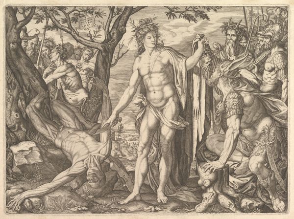Michel Dorigny created this print, "Pan and Syrinx" in the 17th century, a period marked by rigid social hierarchies and patriarchal norms. This context is crucial to understanding the print's depiction of gender and power. The image portrays the mythological tale of Pan's pursuit of Syrinx, a nymph who flees his advances and is transformed into reeds to escape him. Dorigny's rendition captures a moment of intense struggle, with Pan reaching out to capture Syrinx as she is surrounded by other nymphs and a river god. The narrative of Pan and Syrinx has been interpreted in many ways over time, sometimes seen as a simple tale of chase and escape, and other times as a commentary on desire and transformation. However, viewed through a contemporary lens, the print raises questions about consent, agency, and the representation of female bodies. Is Syrinx a willing participant in this encounter, or is she a victim of Pan's relentless pursuit? This print invites us to consider the enduring relevance of these issues and the ways in which art can both reflect and challenge societal norms.