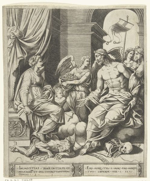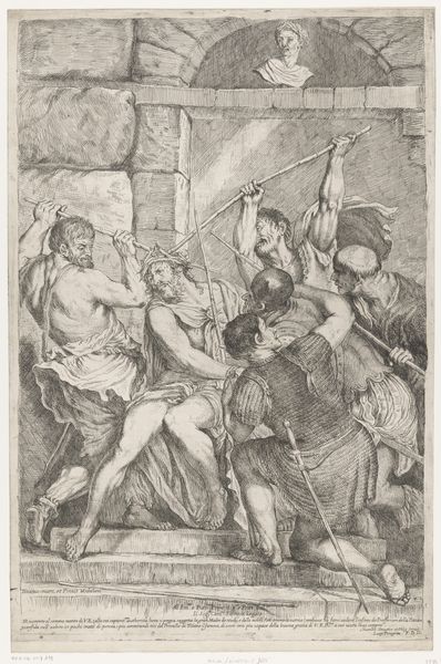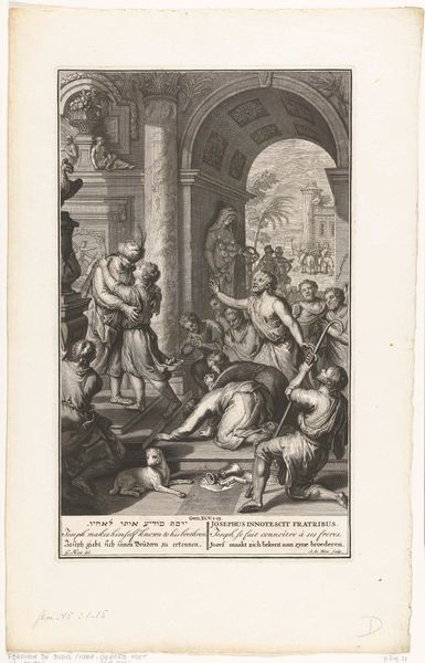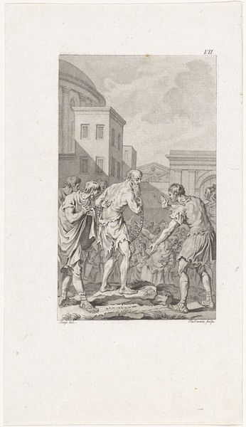 Editor: Here we have Gabriel de Saint-Aubin's "The Challenge [right]," created around 1760 using etching and engraving techniques. There’s something dramatic about this scene, a clear hierarchy implied by the central figures. How do you interpret this work? Curator: Considering the title and the historical context, particularly the prevailing social structures of the time, the "challenge" could be read as a moment of resistance against patriarchal authority. The woman kneeling, chained, represents a subjugated figure, yet the scene’s staging – the gazes, gestures – suggest a potential for disruption. Do you notice how the architectural setting, the classical columns, evokes a sense of established power? Editor: Yes, absolutely. It feels as though she's been put on trial or something similar, held in a staged public setting to highlight the consequences of some transgression. I guess, maybe, how would you explore a feminist reading of this work, going beyond the surface-level narrative? Curator: Let’s consider her vulnerability, contrasted with the men’s stances of authority. It calls into question the accepted narratives around power dynamics. Saint-Aubin gives us not simply a historical scene, but a study in gendered power, its performance and, crucially, its potential subversion. One might ask, what actions, perhaps outside of what is shown in the print, led this figure to be subjugated. Editor: It's thought-provoking to consider the unshown parts of the story to reflect on what happened and what could happen. I hadn't considered that potential for subversion initially. Thanks for expanding my view! Curator: My pleasure! Examining art through an intersectional lens lets us re-evaluate historical narratives. It’s about interrogating not just what we see, but the structures of power that frame what is visible.