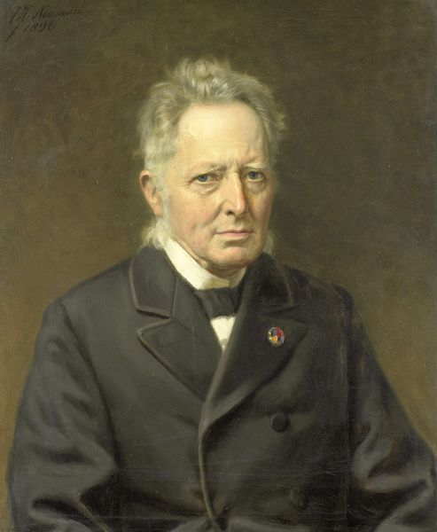 Curator: This portrait, rendered in oil on canvas, is entitled "Pieter Mijer (1812-81). Gouverneur-generaal van Nederlands Oost-Indië." It dates back to 1876 and was crafted by Johan Heinrich Neuman. What's your initial impression? Editor: There's an undeniable gravitas, almost somberness to the portrait. The muted palette certainly contributes to this effect. He appears quite stoic, though his gaze holds a hint of… weariness, perhaps? The composition is formal, certainly befitting his stature. Curator: Absolutely. Considering Mijer’s role as Governor-General of the Dutch East Indies, the formality serves a specific purpose. Portraits of colonial officials were crucial tools for projecting authority back to the colonizing nation and for asserting their presence within the colonies themselves. Editor: Note the very precise brushstrokes rendering the details of his garments and medals. It emphasizes materiality—silk, velvet, gold—that signifies power, but is there perhaps a lack of dynamism in the pose? Curator: Well, artistic styles were bound to their time. The rigid, formalistic pose adheres to the conventions of official portraiture from that era, highlighting realism and power. But also, consider how portraits legitimized power dynamics inherent in Dutch colonial rule. It's about representation, of course. Editor: Representation yes, and the weight of that authority is evident even in something as simple as the restricted colour palette or limited brushstrokes. The way the artist manipulated light and shadow almost sculpts his face, making it seem imposing. I think there’s an artistry in achieving such impact. Curator: And in presenting a figure destined to reinforce particular power dynamics back in the colonizing country. Neuman's representation would reaffirm colonial structures within both Dutch society and the broader historical context of colonialism. His realism places him not as an ideal, but an authority. Editor: It does make you reflect on how much a painting is not just an aesthetic object, but an instrument of power, especially in an era defined by expansion. I suppose, on one hand, it reflects the politics of its time in ways a landscape painting never could. Curator: It certainly offers a starkly different aesthetic purpose to something like Van Gogh’s paintings of sunflowers, yes? In any case, the opportunity to understand Mijer's importance within a changing socio-political atmosphere becomes all the more rich because we’re standing in front of this canvas. Editor: Indeed, analyzing the tension and interplay between these various factors illuminates why a seemingly straightforward image holds immense complexity.