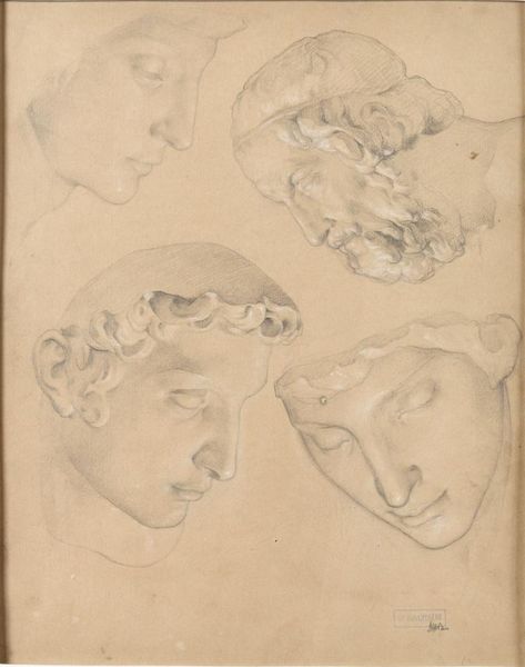 Curator: Let's turn our attention to this intriguing study by Peter Paul Rubens entitled "Two human female faces and two noses–one human, animal." The artwork’s skeletal presentation strikes me immediately. Editor: Indeed. It feels clinical almost, an anatomical investigation laid bare. The lines are so stark, rendering the features without the softness we often associate with portraits. There's a deconstruction happening here. What is he trying to show us? Curator: I see it as an exploration of ideal form. Look at the meticulous attention given to the planes of the face, the careful rendering of light and shadow defining the musculature. It is form distilled. Notice, too, how the isolated noses further abstract the anatomical study from the human into studies in forms, shadows, and light. Editor: Yet the noses introduce a point of potential subversion. You said that these facial studies work to express form, but this reading doesn't account for why one of the noses is distinctly animal. Here, Ruben draws an unsubtle tie to animalism which, especially when studying the 'ideal form', speaks to troubling traditions in phrenology and early criminology which attempted to link moral depravity to outward appearance. It’s uncomfortable. Curator: I agree that these associations certainly can cause a degree of discomfort. The contrast you identify between the refined human features and the crudeness of the animal nose highlights the tension within Ruben’s representation of beauty, its formal characteristics become an uncomfortable reflection. Editor: It forces a consideration of what ideals truly mean. The piece is unsettling. How can our aesthetic values perpetuate ideas about whose humanity matters, and whose does not? It becomes a question of visibility itself – who is rendered fully, with sensitivity, and who is reduced to parts that index something “less than”? Curator: An excellent point; it reminds us that even seemingly objective studies carry with them cultural and historical baggage. Editor: Exactly, and this recognition allows us to examine art's role in either reinforcing or dismantling those deeply embedded ideologies. Curator: Well, this has certainly given me much to consider. A deconstruction with unexpected social insight! Editor: Yes, a clinical exploration turned reflective examination of power. Compelling.