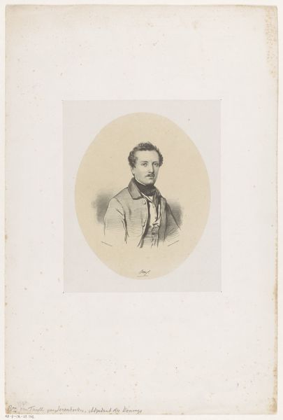 Editor: Here we have "Portret van Eduard Maria Oettinger," made sometime between 1826 and 1840. It's an engraving. It has a formal, almost severe, quality to it, framed as it is. What strikes you about it? Curator: Well, let's unpack that severity. Engravings like these often served a very specific purpose. Who was Oettinger? And what stories do these kinds of formal portraits reinforce about power and social class in the 19th century? Consider how portraiture like this was intrinsically linked to constructing and perpetuating specific notions of masculinity and authority. Editor: It makes you think about who gets remembered, and how, doesn't it? I see that he was a writer and literary critic. Does that change your view? Curator: Absolutely. Knowing he was a writer shifts the lens. We can think about the rise of literacy and the press, the dissemination of ideas. This isn’t just a portrait of a man; it’s a portrait of a man intimately connected to the burgeoning public sphere. How might his writings have challenged or reinforced the status quo? Editor: So the portrait becomes almost a document of intellectual history? Curator: Exactly! The trappings of formality – the suit, the stern expression – are not just about individual identity but speak to broader social roles and power dynamics. We must ask, how does this image function within the historical context of intellectual and social movements of his time? Editor: That adds so much depth to what initially seemed like just a stern face. It's about participation in broader social dialogues! Curator: Precisely! Looking closely allows us to examine whose voices get amplified, and it pushes us to look critically at what kinds of narratives these images are constructing, and perhaps concealing. It goes far beyond capturing mere likeness. Editor: Thanks, that really reframed how I see this! Curator: Indeed, historical portraits are seldom ever simply just images.