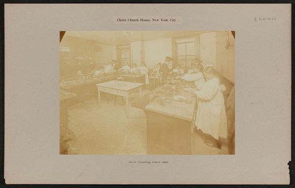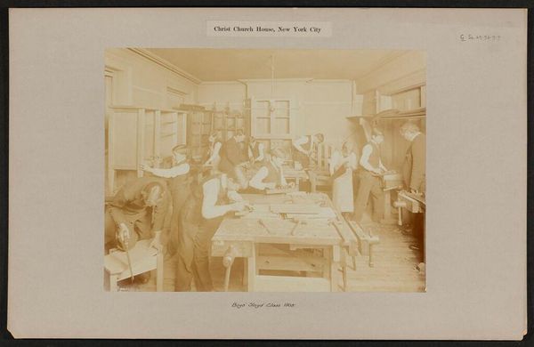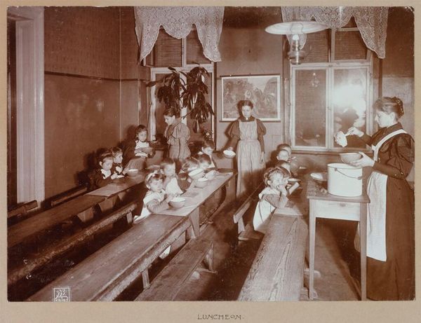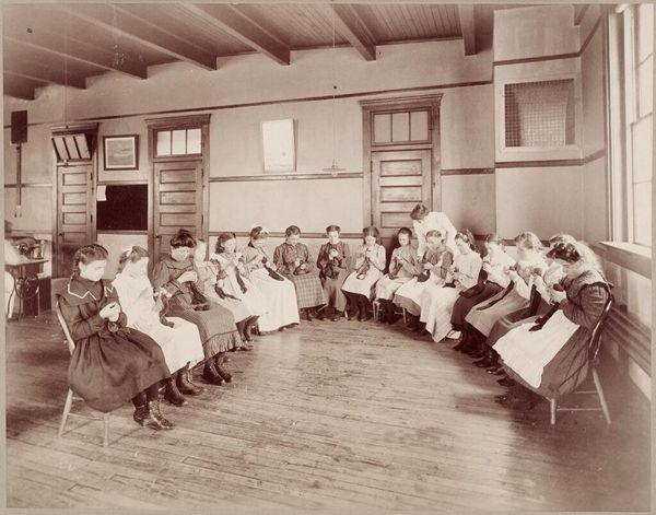 Editor: This photograph, titled "Defectives, Feeble-minded: United States. Massachusetts. Waverly. School for Feeble-minded: Massachusetts School for the Feeble-Minded.: Color Lesson." by William A. Webster, shows a classroom, seemingly in the late 19th or early 20th century. The sepia tone lends a somber, institutional feel. What do you see in terms of its visual composition? Curator: The composition is quite formal and hierarchical. Note the strong horizontal lines created by the desks and the windows, balanced by the verticality of the doorway and the students themselves. The light, entering from the windows, draws the eye but remains diffuse, creating a sense of uniformity rather than highlighting individual subjects. Editor: The uniformity feels unsettling, given the title. The arrangement of objects and people is clearly deliberate. Curator: Precisely. Observe the repetition of forms—the desks, the animal figures—and the way this repetition underscores the institutional nature of the scene. The absence of a clear focal point further emphasizes the systematic control. What does this suggest to you? Editor: I hadn't considered that. It’s a very controlled composition, which enhances the rigid atmosphere. Thanks for pointing out the formal elements and how they construct meaning. Curator: Indeed. By analyzing the form, we gain insight into the intended message.