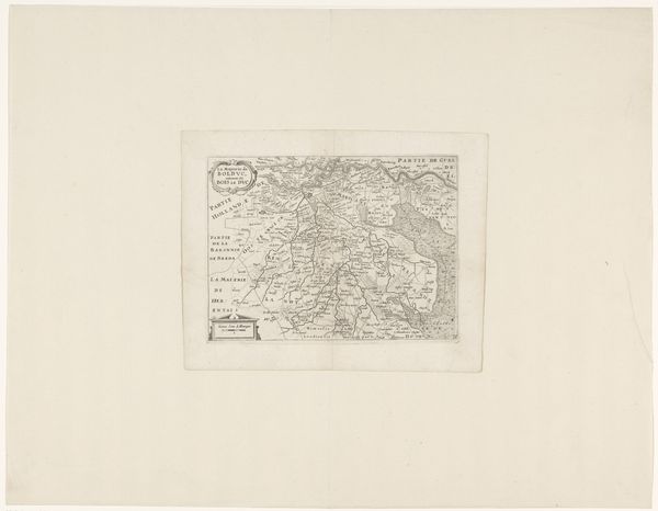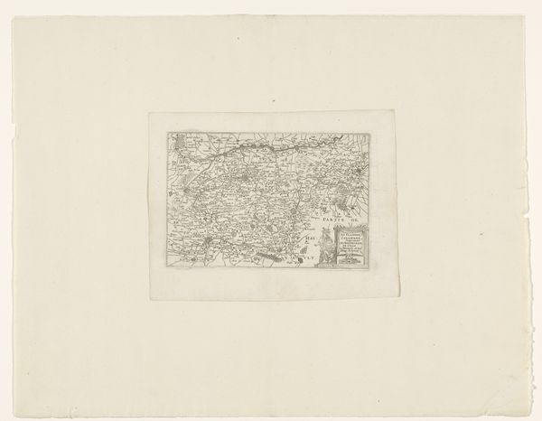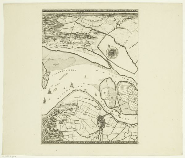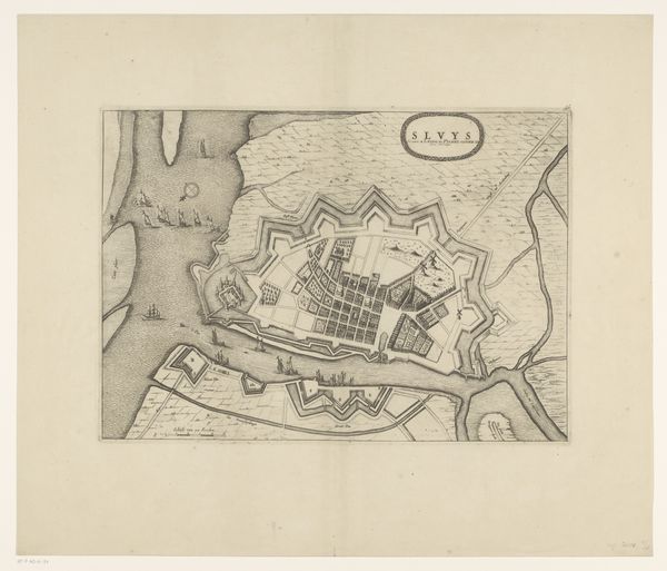 Editor: Here we have a print from 1681 titled "Kaart van het beleg van Groenlo, 1627", meaning "Map of the Siege of Groenlo". It's ink on paper. It gives me a sense of looking at a game board, with all those precise geometric shapes and lines. What do you see when you look at this work? Curator: Immediately, I'm drawn to the stark contrast achieved through the ink on paper. The engraver's skill is evident in the precision of each line, defining forms and spaces with clarity. Notice how the artist employs hatching and cross-hatching techniques to create tonal variations, suggesting depth and texture, and note the sharp delineations. Are you drawn to any specific visual aspect of the composition? Editor: The shapes themselves are interesting; I can make out some walled fortifications and what looks like open fields. But overall it still comes across as quite abstract. Is there a reason for that, considering that it’s supposed to be a historical map? Curator: Abstraction arises from a specific viewpoint. The artist prioritized capturing the geometric relationships between elements. Observe how the circular and rectangular shapes are positioned and interconnected by lines— the fortifications as opposed to roads or paths that cut across these planes and forms. Consider what kind of spatial logic is produced, rather than what is naturally rendered. Editor: So you're saying it’s less about faithfully recording reality and more about how the elements are arranged formally. It reminds me that cartography itself has a stylistic language, right? Curator: Precisely. Think of how the artist organizes these symbolic shapes, utilizing contrast, line work, and the balance of positive and negative space to present a visual argument about order and control. What impression do you have? Editor: Now I can see how focusing on line, shape and composition gives a different insight; the "map" reveals the strategy and imposition of order, a very powerful expression by using graphic, yet limited visual tools. Curator: A great observation about this kind of formal power – something I missed initially.