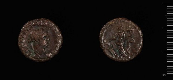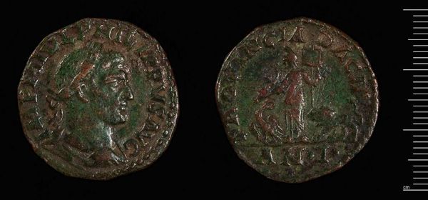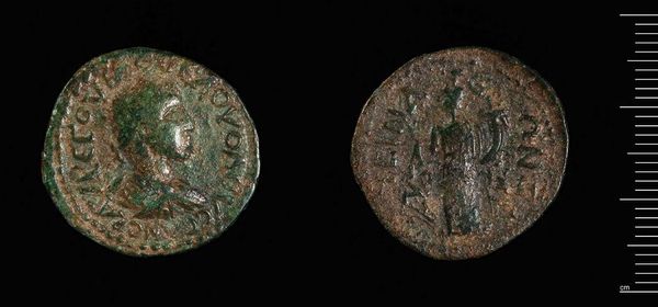 Curator: Here we have a tetradrachm minted in Alexandria during the reign of Gallienus. I'm struck by the echoes of power and empire resonating from something so small. Editor: I'm immediately drawn to the patina; the verdigris whispers of countless hands and centuries past. It makes me consider the economic systems at play during that era. Curator: Absolutely. This coin served not only as currency but also as a medium for imperial propaganda, with the emperor's image carefully rendered to project authority. Editor: And what of the symbolism on the reverse? The figure appears to be an eagle. Is it an allusion to the divine authority of the emperor? Curator: Indeed, the eagle, a symbol of Jupiter and Roman power, reinforces that link. It speaks volumes about the symbolic language used to legitimize rule. Editor: Looking at this coin, I'm reminded that even the most ubiquitous objects carry profound historical and cultural weight. Curator: Yes, a single coin can encapsulate an era's ambitions, anxieties, and beliefs.