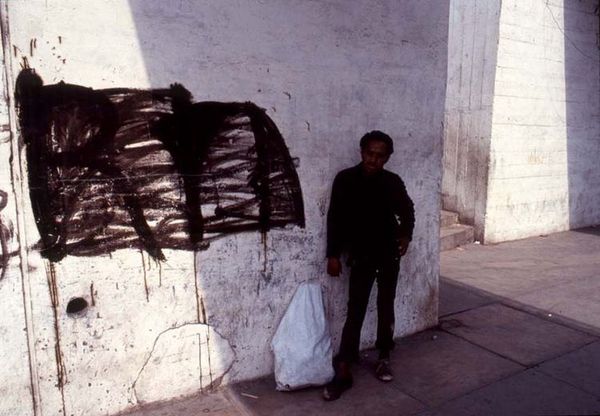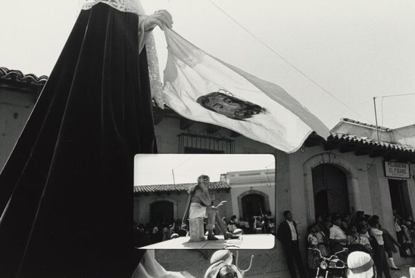 Editor: So this is Robert Rauschenberg’s "Chinese Summerhall," taken in 1983. It's a photograph, and it strikes me as an everyday street scene, almost a still life. The array of textiles hanging overhead is visually compelling. What do you see in this photograph? Curator: It’s fascinating to consider Rauschenberg’s focus here. I see a deliberate highlighting of the materiality of these textiles and garments. He’s documenting the labour involved in the textile production and commerce; what kinds of fabrics do you think they are and where do they come from? Editor: They look like silk scarves, maybe cotton too – definitely hinting at local production for the Chinese market. But isn't there also something to be said for his gaze as a Western artist, capturing this slice of life? Is that too simplistic? Curator: Precisely. It raises crucial questions about the global circulation of goods and cultural exchange. Consider the very act of photographing: film, the camera – these are also materials with specific origins and histories that mediate our understanding. What is being bought, sold, bartered or traded. Are those processes fairly priced? Who is involved in making them available? Editor: That shifts the perspective, almost making the process itself – from creation to display – the subject, rather than the aesthetic appeal of the colors or the composition. So how does this shift our understanding of "high art"? Curator: Exactly. Rauschenberg is challenging those boundaries. The everyday, the mundane – becomes worthy of artistic attention. He brings in the production methods, which includes highlighting and revealing processes often kept out of discussions regarding art history and meaning. Editor: I never considered art with that kind of depth before! I’ll have to keep the material process and the social-cultural backgrounds in my future considerations of the image and the photographical apparatus itself, as more than simply a snapshot of China! Curator: Indeed, always look beyond the surface! There is much more than an appealing image that must be addressed and analysed for artistic interpretation.