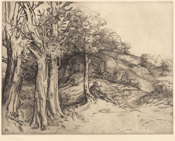 Karl Peter Burnitz created this drawing, Forest Path, using graphite. The eye is immediately drawn to the path, which cuts a diagonal swathe across the composition. It leads the eye into the depths of the forest, where the density of line and form blurs the distinction between individual elements. Burnitz's handling of line is particularly striking. Note how he uses hatching and cross-hatching to create a sense of depth and shadow, pulling the viewer into the heart of the forest. The density of these lines creates a texture, almost a palpable sense of the forest floor and the tangled undergrowth. This dense application of graphite destabilizes the traditional landscape. It is no longer a serene vista but a space of visual complexity and material presence. Consider how the artist challenges fixed meanings, inviting us to see beyond the mere representation of a forest. Instead, we see a meditation on form, texture, and the very act of seeing itself.