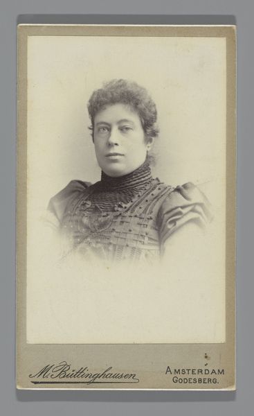 Editor: This is "Portret van Charlotte van Braam" by E. v.d. Kerkhoff, created sometime between 1895 and 1908 using photography. I’m struck by the soft, almost faded quality of the photograph. What can you tell me about the artist’s technique here? Curator: Notice first how the artist, while working in the medium of photography, has seemingly prioritized soft tonal gradations. This aligns with Pictorialism, where the formal qualities—line, tone, and composition—were paramount. Editor: Pictorialism. So, less about capturing reality directly? Curator: Precisely. Consider how the subject’s dress almost blends into the background, unified by the artist's tonal consistency. Where does your eye go first? Editor: I’d say her face. There is also the repeated pattern in the neckline that feels kind of dizzying when you stare too long. Curator: Good. The artist’s treatment of her dress does not render texture; the form is implied and contributes more to tonal values. That neck accessory, too, draws our eye back up to her face again. Are there many sharp lines or clear contrasting edges that define forms? Editor: Not really, no. Everything feels diffused. It makes her seem like she’s emerging from a mist. Curator: It does indeed. The artistic decisions draw focus on subjective expression rather than objective representation. Editor: I see! So by focusing on the formal elements like the tone and soft focus, the photograph takes on an artistic quality beyond just being a record of a person. It’s like the medium is secondary to the artistic intent. Thanks, that makes a lot more sense.