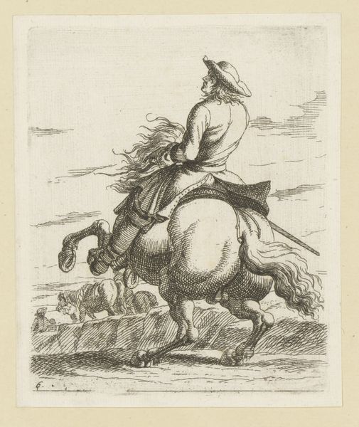Curator: Here we have "Ridder met een vrouw te paard," or "Knight with a Woman on Horseback," created sometime between 1783 and 1850, by Louis Moritz. It’s currently held here at the Rijksmuseum, and rendered in pencil and ink. Editor: Oh, it feels like a stolen moment from a fairytale, doesn't it? All haste and yearning in a fleeting landscape. I imagine they're running away together; look how the horse stretches! It almost breaks the constraints of the drawing; there's the romance! Curator: Interesting observation. I think the drawing hints at broader cultural anxieties. During that period, there was an increased fascination with the medieval, but also evolving attitudes towards class and social mobility are worth noting. What does this drawing imply about social transgression, escape, and desire during its historical context? The quality and availability of paper during this time shaped drawing as both fine art and preparatory sketch, let's keep that in mind. Editor: Perhaps; yet, I can't shake the sense that this piece focuses on the individual stories rather than class politics. Isn't it delightful that, in spite of his armor, they look to each other, a loving and intimate glance that softens the harsh world surrounding them. Curator: Maybe. But the armor, the horse, the materials of the drawing itself are important in the image's narrative. Armor's function evolves in both the literal protection on the battlefield and symbolic projection in art to create commentary on protection and status. Editor: True enough; though you speak about materials as meaning; to me the open-ended sketchy linework lends this such a delicate, precious mood, almost vulnerable. Curator: I see your point; the pencil and ink’s sketchy form democratizes the image, it is accessible. Its potential production and reproduction through printing practices open its story to wider consumption and social reimagining during the 18th and 19th centuries. Editor: Absolutely! Now it resonates even further than its original timeframe. It is intriguing how even today these characters can transport us to dreams of valor and romance.