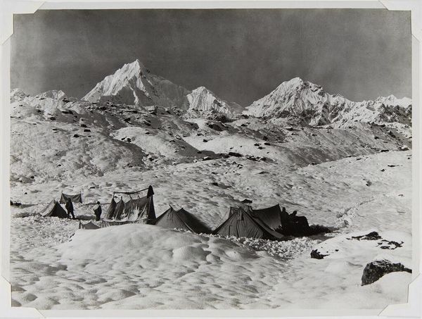 Curator: This is Vittorio Sella’s, On the Baltoro Glacier, a landscape photograph housed here at the Harvard Art Museums. It depicts a stark, mountainous scene. Editor: My first impression is of immense scale, coldness, and an overwhelming sense of geological time. Curator: Sella was renowned for his technical mastery of large-format photography. His process involved arduous climbs with heavy equipment to capture these remote locations. The print itself becomes a testament to labor. Editor: Indeed. And the images quickly became associated with adventure and exploration, shaping public perception of these distant, inaccessible places. They served a socio-political function in framing notions of wilderness. Curator: Precisely. The materiality of the photograph—the paper, the chemical processes—links it to a specific moment in photographic technology and its dissemination. Editor: Yes, but also consider how the image itself, widely circulated, contributes to the mythology and narratives we create around untouched landscapes. Curator: So, in essence, the material and the historical context are inseparable. Editor: Exactly. A chilling, but vital piece for us to consider today. Curator: I agree, and a reminder of the tangible processes behind even the most seemingly timeless images.