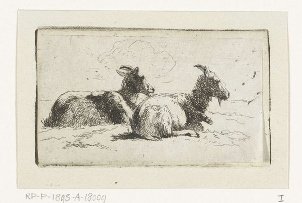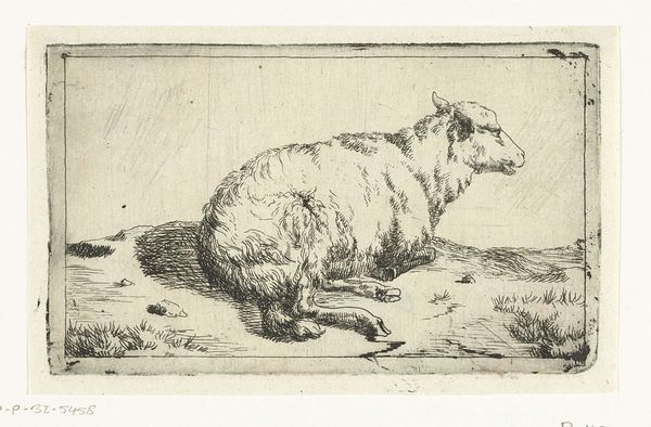 Curator: Here we have "Goat and Three Sheep" by Joseph Roos, from 1754. It's a delicate etching. Editor: It's remarkably gentle for an image of livestock. There’s a quietness, an almost domestic intimacy in how these animals are grouped. Curator: Considering the likely socio-economic function of sheep at that time, though, that gentleness is interesting, isn't it? The materiality itself – the etching, the paper – points to a certain level of accessibility in reproduction and dissemination. Were these images primarily for the wealthy landowners, or was there a broader market? Editor: Absolutely. The composition gives me pause too. We see the ram’s magnificent horns almost dominating the frame. This portrayal disrupts the simplistic agrarian narratives so common in art from the period. What power structures were at play in the lives of shepherds and their flocks? Were people being dispossessed, pushed into more intensive forms of production at the time of its making? The image prompts questions about social dynamics. Curator: That focus also connects to the actual labor embedded within creating an etching like this. Think about the repetitive, skilled actions to produce it. Did Roos have apprentices? The etcher’s labor matters as much as that of agricultural workers portrayed here. Editor: And if we unpack those implications, the image becomes more politically charged. What does it mean to aestheticize labor or the means of survival without addressing inequalities? Curator: Perhaps that's where the deceptive charm of it lies. These scenes offered an appealing, accessible, romanticized glimpse of an existence still profoundly connected to the means of making a living at a time of emerging industrialization. Editor: You’ve given me much to contemplate. A picture is never just a picture; it’s a portal to power structures, histories of making, and human-animal relations that resonate across time. Curator: Agreed. It really challenges our simplistic view of rural idyll.