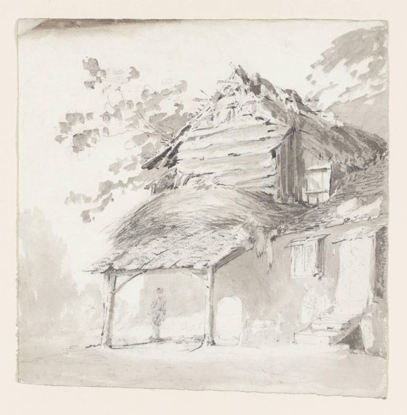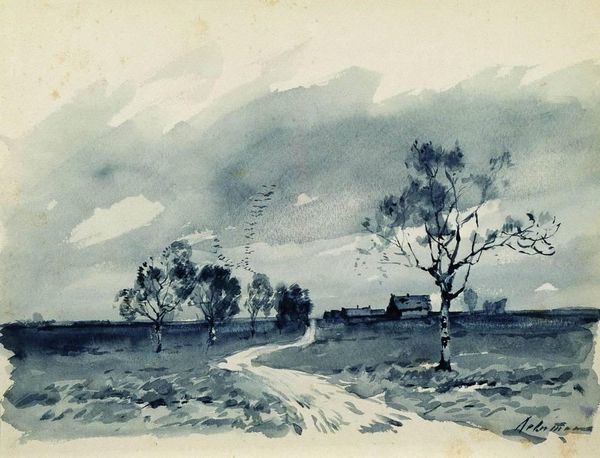 This drawing by Isaac Levitan, made around the late 19th century, captures a village scene using graphite on paper. The initial impression is one of muted serenity, achieved through the artist’s subtle handling of tonal variations and the delicate lines that define the rural landscape. Levitan employs a compositional structure where the eye is led from the foreground towards the horizon, creating a sense of depth. Notice how the skeletal tree to the left acts as a vertical anchor, its branches echoing the linear patterns found in the thatched roofs and fences. This repetition of form creates a visual harmony, but also introduces a certain tension, characteristic of the Symbolist movement, hinting at themes of transience and nature’s cycles. The monochromatic palette further contributes to this atmosphere, where light and shadow play a crucial role in defining the forms, blurring the lines between realism and emotional expression. This interplay invites us to contemplate the painting’s deeper, more philosophical undertones, engaging with questions of human existence within the broader scope of the natural world.