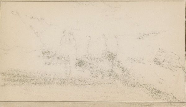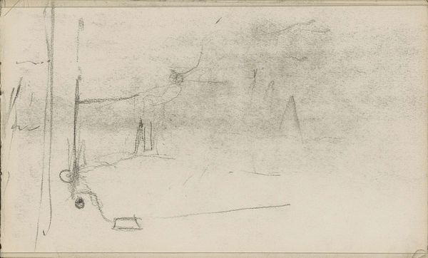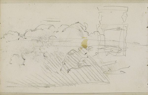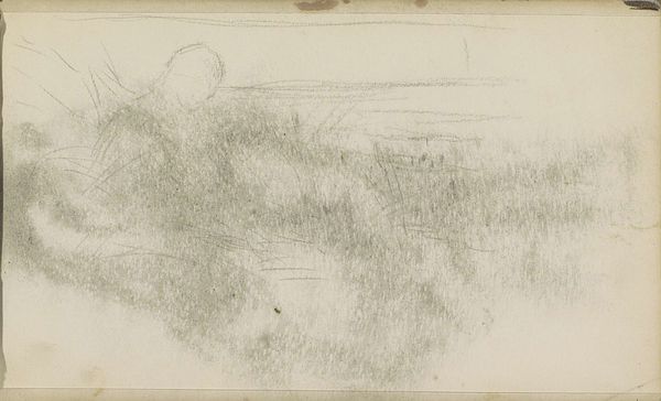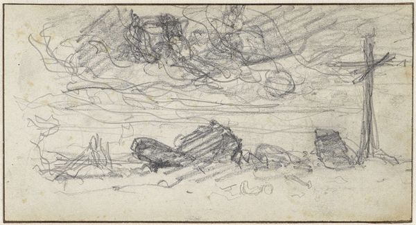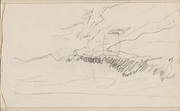 Editor: Here we have "Studie, mogelijk van een landschap," which translates to "Study, possibly of a landscape," created sometime between 1881 and 1927 by Johan Antonie de Jonge. It's a graphite and pencil drawing on paper that really feels like a fleeting moment captured in a personal sketchbook. What do you see in this piece? Curator: Well, my dear Editor, at first glance, it whispers of hushed mornings, doesn't it? Imagine the artist, pencil in hand, stealing away to capture the nascent light kissing the landscape. The hesitant lines, the barely-there texture—it’s as though we're eavesdropping on a private conversation between the artist and nature. Makes you wonder, what was he feeling at that moment? Frustration? Excitement? Or just pure, simple joy? Does it feel complete or incomplete to you? Editor: It feels unfinished, almost like a haiku – suggestive rather than explicit. There's this wonderful open space above the horizon line, giving me a sense of possibility. But it’s also undeniably…sketchy. Curator: Precisely! That incompleteness *is* the point, isn’t it? We aren't meant to see a polished masterpiece but a glimpse into the artist's process. These were the years when artists weren't just reproducing reality, they were trying to capture feelings, moods, and sensations. What would you say this picture would feel like, if it was a color or even a smell? Editor: I see it as a faded sepia, with the earthy smell of aged paper, a distant wood fire and early dew on the grass. This feels intimate somehow. Like discovering a secret left just for me, maybe. Curator: That’s beautifully put. It reminds us that even these fragmentary moments, these near-invisible whispers on paper, hold immense value. Thank you. Editor: Thank you for helping me truly ‘see’ the possibilities within this work and the soul within this simple scene.