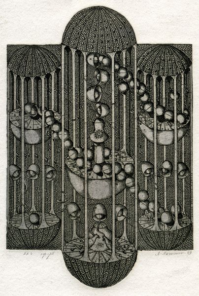 Oleksandr Aksinin made this print, "Glasses," sometime before 1985, using what looks like pen and ink. I love the way Aksinin is working in a limited palette and repeating marks to create something magical. The texture is incredible, like the dark blue ground is alive with tiny dots, and the "glasses" themselves, or are they towers?, have this shimmery, almost vibrating quality. Look at how each little dot of ink has been carefully placed to build up the image, like a kind of pointillist vision of the world. It feels obsessive, but in the best way, like the artist is really seeing and feeling every little bit of what he's depicting. That repetition creates rhythm, but it also feels like a meditation, a way of slowing down and paying attention. Aksinin's work reminds me a bit of Paul Klee, in that way of finding big meaning in small marks, of building up a whole world from simple shapes. It's a good reminder that art isn't always about grand gestures, but about the power of process, too.