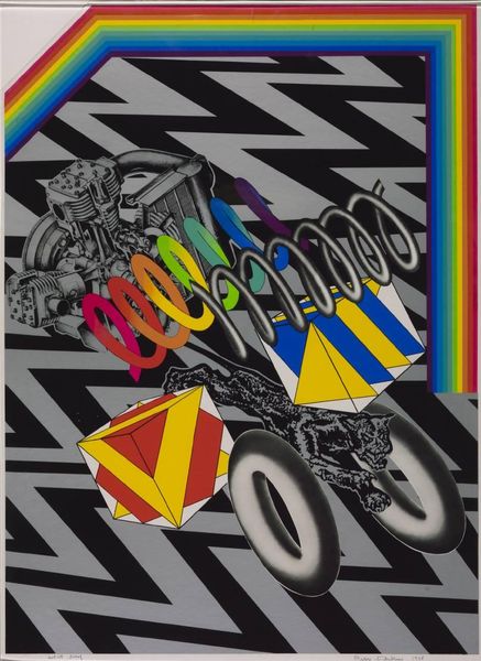 Editor: So, this is Peter Phillips' "2. PNEUmatics." It’s hard to pin down a date, but the materials give it a distinct feel. What strikes me is the sheer density of imagery and the bold use of industrial motifs. What do you see in this piece? Curator: I see a commentary on mass production and consumption through the lens of Pop Art. Phillips appropriates and juxtaposes images of car parts, tyres, and geometric shapes, highlighting the materiality of everyday objects and their role in a consumerist society. What's the social context of mass manufacturing here? Editor: Do you think the geometric forms are meant to critique or celebrate the standardization inherent in industrial production? Curator: Perhaps both. By elevating these mundane objects and processes to the realm of art, Phillips forces us to confront our relationship with the products of labor and the systems that produce them. This really makes you think about how our society values things. Editor: Absolutely, I never considered how much the process is part of the message.
