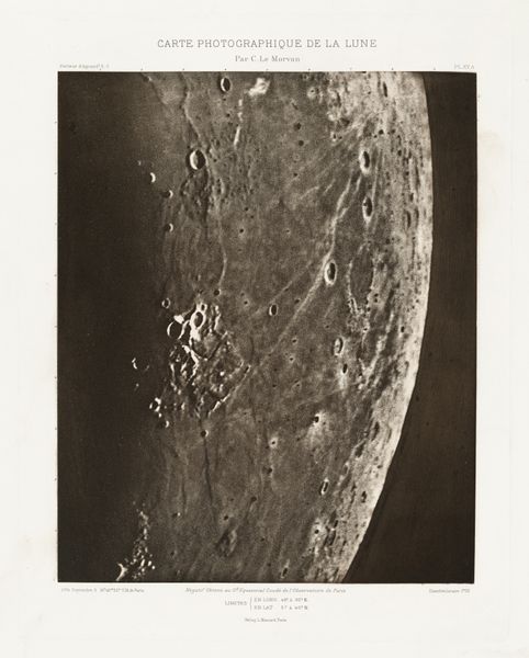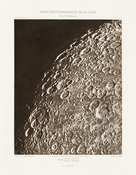 Curator: This arresting image immediately draws me in with its stark contrasts—the luminous curve against the inky void. It feels ancient, almost primordial. Editor: Indeed. What we are looking at is a photogram print entitled "Carte photographique de la lune, planche VI," or "Photographic Chart of the Moon, plate VI," possibly created between 1901 and 1914 by Charles Le Morvan. Curator: A chart, you say? That suggests a scientific purpose, stripping away any romanticism often associated with lunar images. But it’s not sterile; it's far more evocative. Look at the play of light and shadow. It’s intensely dramatic. The moon, as an archetype, is potent. Editor: The rise of photography had a fascinating impact on both art and science. In art, it challenged established notions of realism in painting. Meanwhile, science used photography to achieve an unparalleled accuracy in fields such as astronomy. So it serves simultaneously as data and a form of visual poetics. Curator: And that poetry is steeped in symbolism. The moon itself embodies cyclical change, hidden aspects of the self. This fragment—the plate emphasizes its incompleteness— invites us to ponder the unseen, the unknowable. Consider too that the moon’s orbit affects tidal change on Earth; It is not passive, but generative. Editor: Precisely. These charts emerged during a time when institutions like observatories were gaining power in shaping what and how we see. So while this artwork embodies this moment of scientific positivism, in terms of photography it opened new representational forms, shaping the visual lexicon that we recognize today. Curator: It is a potent reminder of our human drive to explore, classify, and ultimately understand the cosmos—but through aesthetic vision that still respects mystery. I now see those lunar symbols less as archetypes, and more as placeholders for cosmic awe. Editor: For me, examining this print highlights that relationship between institutions and artistic experimentation; its effect still felt in how we depict our own earthbound landscapes and the infinite world outside it.