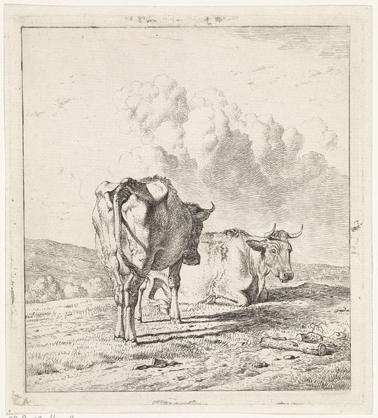 Editor: So, here we have Giovanni Fattori's print, "Horses at Rest," from the late 19th century. It depicts two horses standing in a field, rendered in a delicate, almost ethereal style. There’s a sense of quiet and perhaps even fatigue emanating from the piece. How do you interpret this work? Curator: I find the beauty of this print not just in its pastoral scene, but in understanding its materiality. Notice the etched lines, the artist’s labor made visible. It reflects the daily life and the work of rural laborers through its chosen materials. Consider the physical work the horses and rural workers invested, paralleled to Fattori's physical artistic craft using those very working animals as subject matter. Does the limited tonal range speak to any scarcity of resources? Editor: That's an interesting point! I was initially focused on the overall feeling of tranquility, but now I see the labor aspect much more clearly. Does the printmaking process, in itself, say something about mass production or access to art? Curator: Precisely. Etching allows for multiples, making images more accessible. Was Fattori consciously engaging with this wider potential audience? How did the production impact or benefit working class Italian communities? What type of paper was utilized for the printmaking? Understanding those elements allows for deeper insights into artistic intention and reception. Editor: I never really thought about how the *making* of the artwork contributes to the whole story, but it changes my view completely! Now it is not only about a nice landscape, but a record of its production. Curator: Absolutely! Paying close attention to materials and processes helps to contextualize the artwork historically, and opens up considerations of both the artists' labor and its economic circumstances. Editor: This really helped me to look beyond the image to consider the artistic practice. Thanks so much.