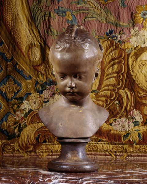 Editor: This captivating marble sculpture, “Cristo Bambino” by Desiderio da Settignano, portrays the infant Christ. I'm immediately struck by the sculpture's serene and almost melancholic aura, amplified by the closed eyes. What aspects of its composition or technique particularly stand out to you? Curator: The piece is remarkable for its tactile qualities and smooth surfaces. Settignano has employed a refined carving technique, evident in the subtle modeling of the child's features and the delicate folds of the drapery. Do you notice how the light plays across the rounded forms? Editor: Yes, the soft light definitely accentuates the gentle curves and almost ethereal quality of the marble, creating a sense of idealized beauty. What do you think the smooth, polished surfaces are meant to evoke? Curator: I would say the polished surfaces reinforce a sense of purity and innocence that aligns with the representation of Christ. Settignano uses the material's inherent qualities to emphasize the subject's character. Consider, too, how the bust form focuses our attention solely on the figure's physical presence and its surface, almost absenting cultural significance for a pure and complete study of form. Editor: I see. So it's less about a narrative and more about appreciating the beauty and form through the sculptor’s artistry. That’s a shift in my thinking. Curator: Indeed. The interplay between the material, the form, and the artist's skill allows us to analyze the sculpture's success based on its internal logic and aesthetic properties. The focus on pure observation without as much external context opens up the piece in interesting ways. Editor: That gives me a completely different appreciation for the work, focusing on the tactile experience and the manipulation of light and form! Thank you! Curator: It has been a rewarding observation.