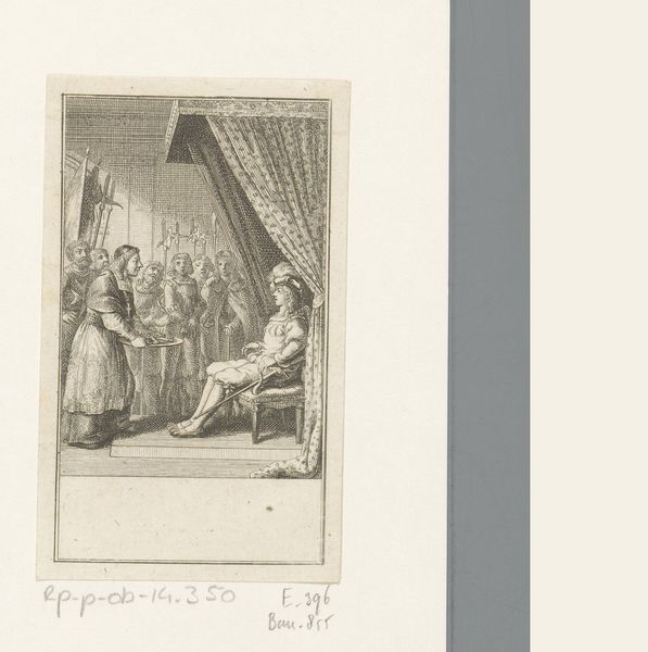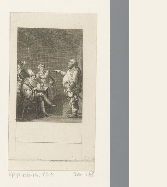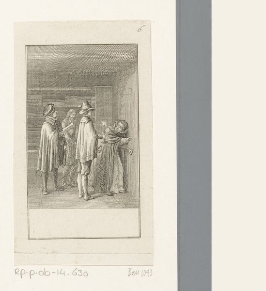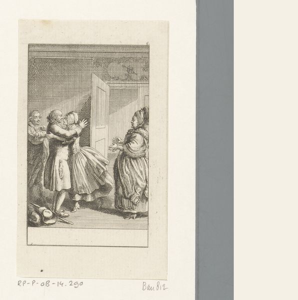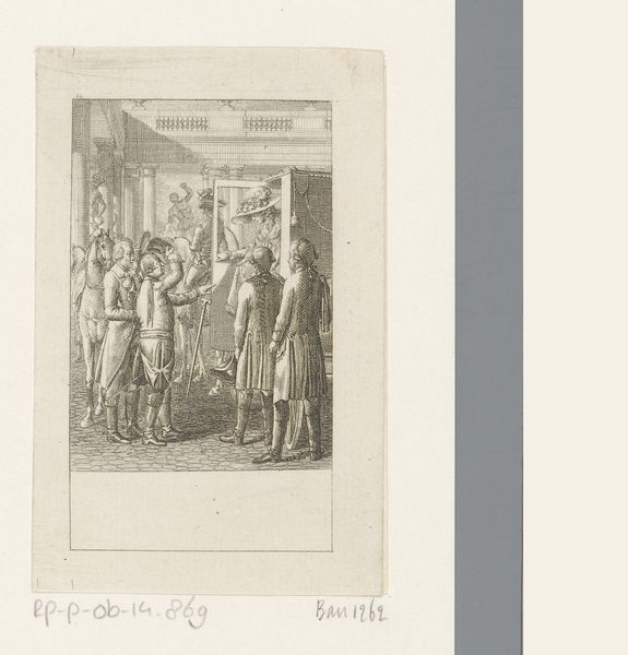Daniel Nikolaus Chodowiecki created this small etching, "Mannen en vrouwen in de rij voor Voltaire," which translates to "Men and women queueing for Voltaire," during a period of great intellectual ferment. During the 18th century, Enlightenment ideals were spreading across Europe, challenging traditional norms and advocating for reason and individualism. Here, we see a diverse group of people, distinguished by their varied attire and postures, waiting to meet Voltaire, one of the Enlightenment’s most influential figures. The scene captures a moment of cultural pilgrimage, where individuals from different walks of life seek enlightenment from a celebrated intellectual. Chodowiecki's work reflects a society in transition, grappling with new ideas about individual freedom, social justice, and the role of reason in human affairs. In its depiction of people seeking knowledge, the etching encapsulates the emotional and intellectual fervor of an era defined by its pursuit of enlightenment.