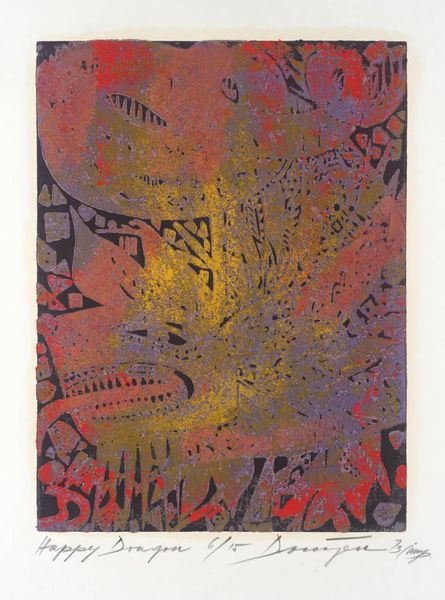 Editor: This is Joseph Domjan's "Blue Poppy." I'm not sure when it was made, but it's currently part of the Tate Collection. The textures and overlapping colors give it an almost dreamlike quality. What do you see in this piece? Curator: I see the poppy, not just as a flower, but as a complex symbol, laden with historical and social weight. How might the choice of the poppy—a flower often associated with remembrance, but also with opiate production—reflect Domjan's experiences as a Hungarian émigré and the shifting political landscapes he navigated? Editor: That's a perspective I hadn't considered. I was only thinking about the visual aspects. Curator: Precisely. Consider, too, how Domjan’s printmaking technique, with its layering and textured surfaces, echoes the complex layering of historical narratives and personal experiences. Can art be a space to question power, even in a seemingly simple floral print? Editor: It definitely gives me a lot to think about. Thanks! Curator: My pleasure. Keep questioning!