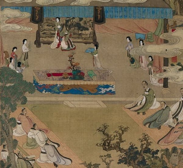 Curator: Chen Hongshou created "Lady Xuanwen Jun Giving Instructions on the Classics" in 1638, using ink and color on paper to depict a historical scene of female empowerment. Editor: Oh wow, it's stunning. The composition, with the figures distributed across these almost dreamlike, layered landscapes...It’s kind of meditative, in a grand, stately sort of way. Curator: The work reflects broader Confucian ideals but also introduces nuanced interpretations concerning women’s roles within scholarly and political spheres during that period. Notice the figure of Lady Xuanwen Jun, poised and central; the painting subtly suggests that her influence extended beyond the domestic. Editor: Right, it challenges a simple reading. It gives a peek into spaces where women, even in historically restrictive environments, shaped intellectual and cultural life. I love how the artist used these thin, delicate lines to draw everything so precise. Curator: Precisely! And consider how her teachings impact the scholars. They all appear deeply immersed, reinforcing themes of learning and social harmony. This speaks volumes about access and privilege within Ming Dynasty society, too. The female figure here can act as a fulcrum for discussing both limitations and agency. Editor: Definitely see that, like they are catching her every word. The layering adds a timeless quality. Do you think this choice of this old looking paper makes the subject matter itself more powerful because we associate history with material that shows its age? Curator: Absolutely. The aging medium speaks volumes, grounding the narrative within its historical context, thus enriching its modern relevance. And the meticulous detail in their garments speaks of prosperity and cultural sophistication of the time, underlining connections between status and access to education. Editor: Makes me want to listen to a lecture! There's an invitation for us to examine power, gender, education, even now. Okay, I’m lost in thought... Time is up! Curator: Precisely. This painting compels us to reconsider historical accounts, to uncover stories that amplify voices previously marginalized and suppressed.
