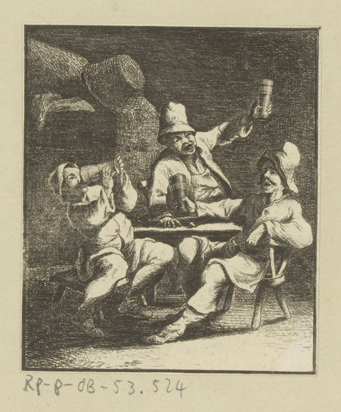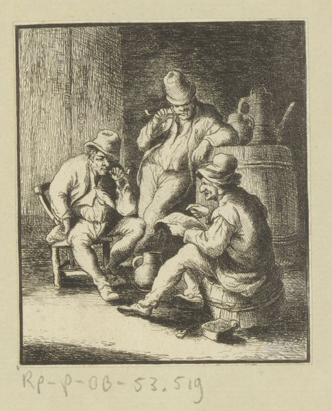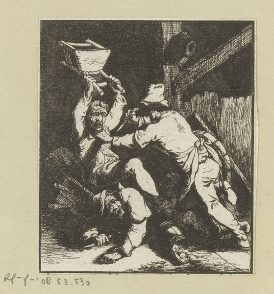 Johann Andreas Benjamin Nothnagel created this small etching of two fighting men and a woman intervening sometime in the late 18th century. It's a scene of low life: an overturned jug suggests a drunken brawl, and a table with playing cards hints at the vice of gambling. Nothnagel was working in Germany, where the cultural memory of the Thirty Years War was still alive. During that time, the fabric of society was torn, and the rule of law collapsed as the population was subjected to the whims of marauding armies. This etching reminds us of the ever-present possibility of violence in everyday life. Looking at this etching through a historian's eyes, we can see how it reflects broader social anxieties of the time. Scholars of political theory such as Thomas Hobbes saw the state as a necessary force to maintain order, so people could avoid the brutish state of nature. Art like this helps us consider the place of such theories in the culture of 18th century Europe.