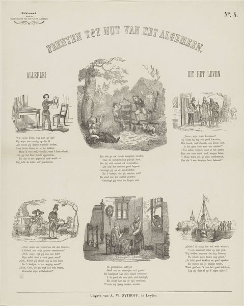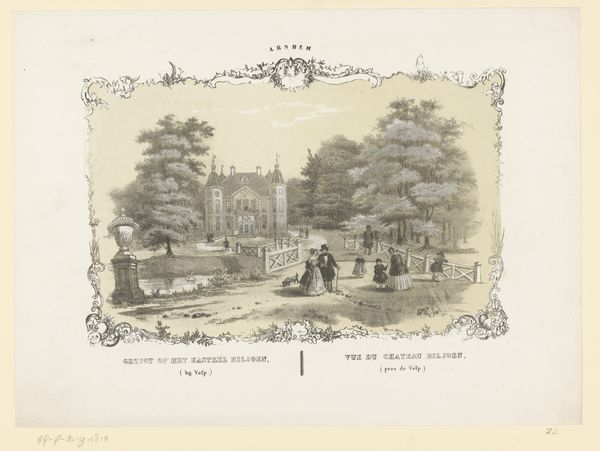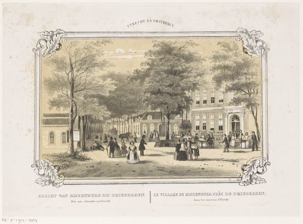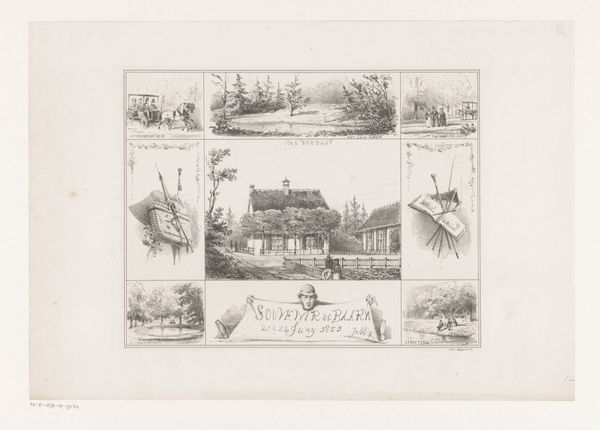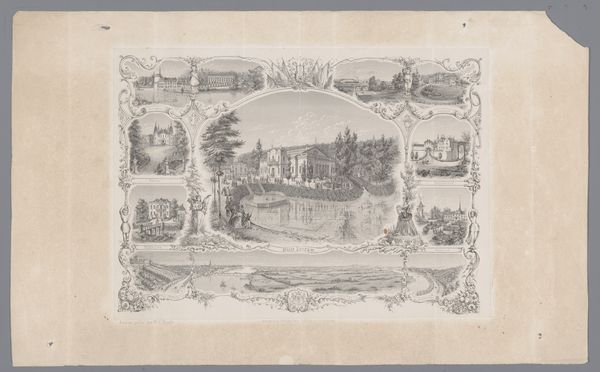 Curator: Here we have "Portret van Otto Gerhard Heldring en door hem opgerichte gestichten," dating from 1848 to 1863. Gerrit Jan Thieme created this work, a compelling example of 19th-century printmaking. It is composed as an engraving. Editor: It has an aura of somber self-importance. The symmetrical layout, the dark rendering of the portrait at its center, and surrounding landscapes evoke a sense of order and…patriarchal power. Curator: Power definitely factors in, thinking of the engraving process itself – the skilled labor and time involved in meticulously carving the image onto a metal plate. And the paper; its quality reflecting the economics of print production. The fact it's a print also means its was accessible for dissemination, so considering notions of accessibility, reproduction and craft is important here. Editor: Precisely. And the imagery too: Heldring, a central figure, is flanked by depictions of his charitable institutions. I’m interested in examining the cultural dynamics embedded in philanthropy during this period: notions of noblesse oblige, class disparities, and the role of institutions in shaping social behavior. Who benefits, who doesn’t? And how does this representation serve to legitimize a particular social order? Curator: Good points. And the landscape depictions also imply a kind of property ownership and control over space, framing him in terms of environmental and also economic power, by his dominion of land and assets. What were the circumstances and material conditions that enabled the construction and maintenance of those buildings? Editor: Exactly, let’s also contextualize Thieme himself, working within the academic art traditions of the time – think about his training, the aesthetic conventions that shape his hand. How much did this artist have agency and did it fit the criteria demanded in this academic form, how might this shape the artist’s hand? Curator: And ultimately, the end result – an easily reproducible image, one that serves as both a portrait and a symbolic advertisement for Heldring’s philanthropy and power and influence, given that engravings allowed for wider audiences. The mode of communication enabled through material process and choices has shaped my perception. Editor: So, an image that on the surface might appear as a simple portrait actually invites layered explorations into societal structure. Its interesting to consider that at this stage of print and artistic conventions its function isn't purely just to immortalize but actively advocate, too.