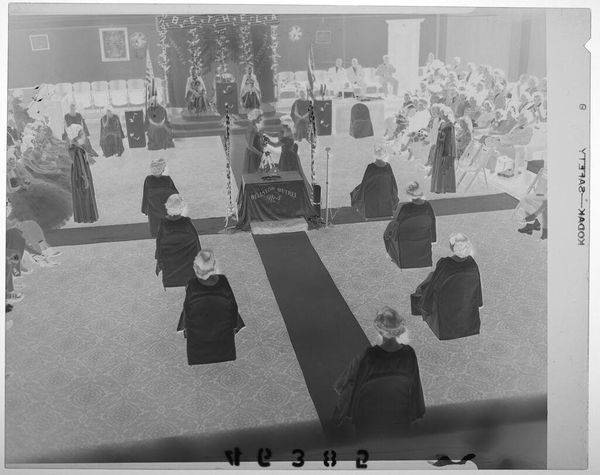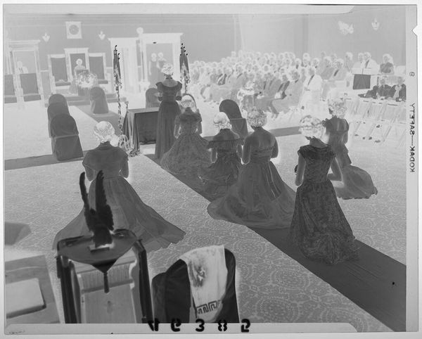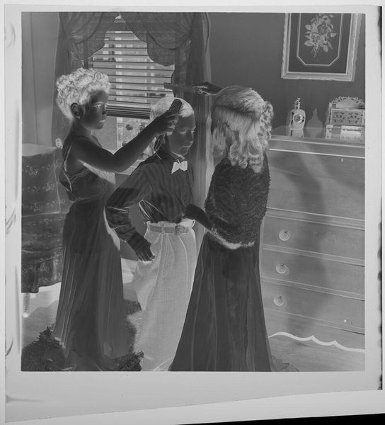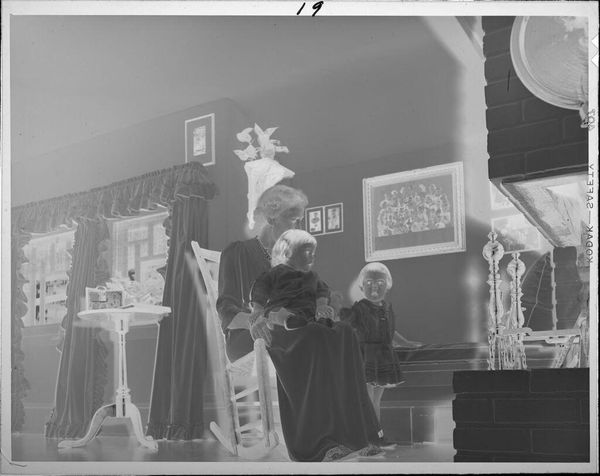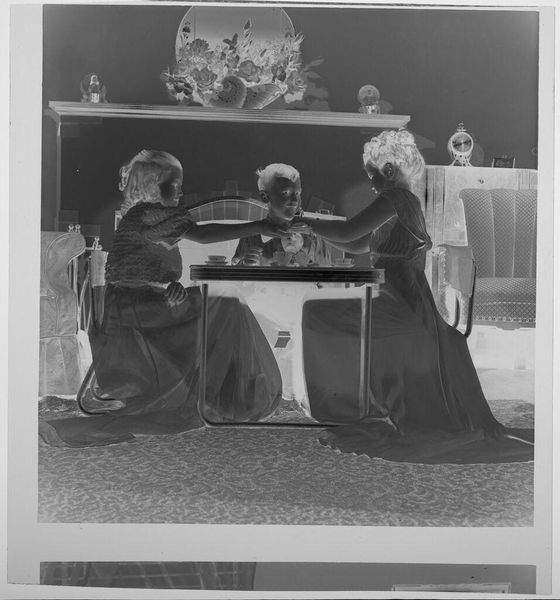 Curator: This photograph, attributed to Lucian and Mary Brown, captures a woman, possibly a mother or grandmother, with two young girls in what appears to be a living room. Editor: The composition feels quite formal, almost staged. There's a stillness to the figures, and the tonal range, even in this reversed image, suggests a focus on texture and form. Curator: Indeed. The grouping echoes traditional Madonna and Child iconography, with the elder woman as a maternal figure and the children representing innocence and familial continuity. Notice the objects in the room, likely important symbols for the sitters. Editor: I'm drawn to the light. The manipulation of light and shadow is interesting, there's a stark contrast creating distinct shapes. That emphasis on form communicates the strength of the subjects. Curator: It’s a fascinating glimpse into domestic life, playing with recognizable archetypes. Editor: It certainly offers a compelling look at familial bonds through a formal lens.
